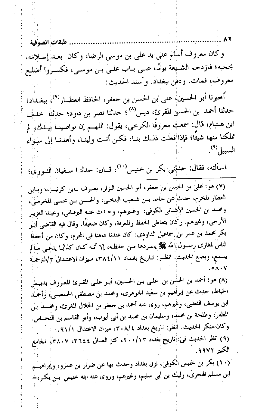 أخبرنَا أَبُو الْحُسَيْن عَليّ بن الْحسن بن جَعْفَر الْحَافِظ الْعَطَّار بِبَغْدَاد حَدثنَا أَحْمد بن الْحسن الْمُقْرِئ ديس حَدثنَا نصر بن دَاوُد حَدثنَا خلف ابْن هِشَام قَالَ سَمِعت مَعْرُوفا الْكَرْخِي يَقُول اللَّهُمَّ إِن نواصينا بِيَدِك لم تملكنا مِنْهَا شَيْئا فَإِذا فعلت ذَلِك بِنَا فَكُن أَنْت ولينا وأهدنا إِلَى سَوَاء السَّبِيل