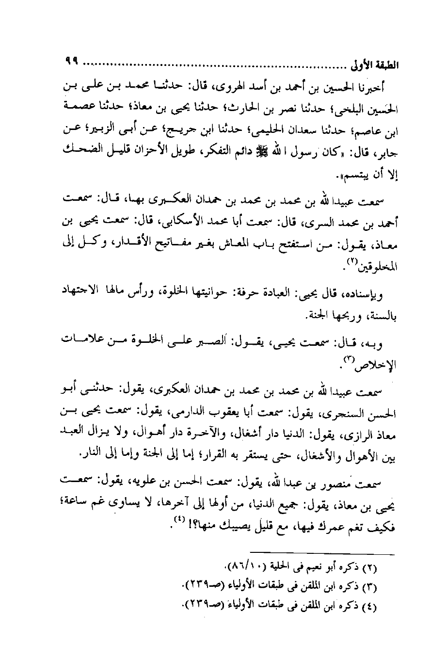 سَمِعت مَنْصُور بن عبد الله يَقُول سَمِعت الْحسن بن عُلْوِيَّهُ يَقُول سَمِعت يحيى بن معَاذ يَقُول جَمِيع الدُّنْيَا من أَولهَا إِلَى آخرهَا لَا يُسَاوِي غم سَاعَة فَكيف تغم عمرك فِيهَا مَعَ قَلِيل يصيبك مِنْهَا