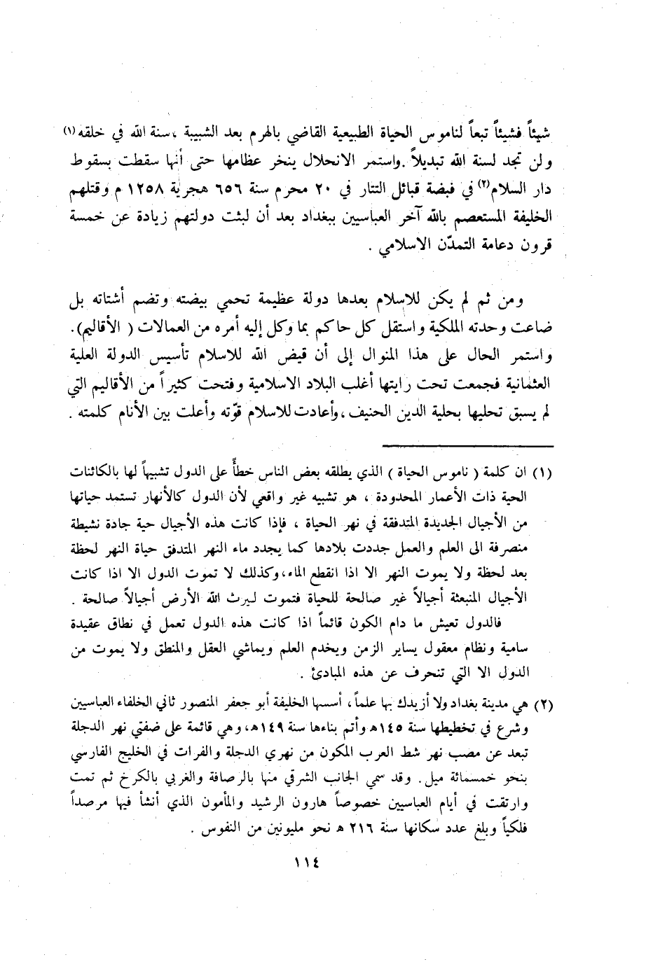 شَيْئا فَشَيْئًا تبعا لناموس الْحَيَاة الطبيعية القَاضِي بالهرم بعد الشبيبة سنة الله فِي خلقه وَلنْ تَجِد لسنة الله تبديلا وَاسْتمرّ الانحلال ينخر عظامها حَتَّى انها سَقَطت بِسُقُوط دَار السَّلَام فِي قَبْضَة قبائل التتار فِي 20 محرم سنة 656 هجرية 1258 م وقتلهم الْخَلِيفَة المستعصم بِاللَّه اخر العباسيين بِبَغْدَاد بعد ان لَبِثت دولتهم زِيَادَة عَن خَمْسَة قُرُون دعامة التمدن الاسلامي