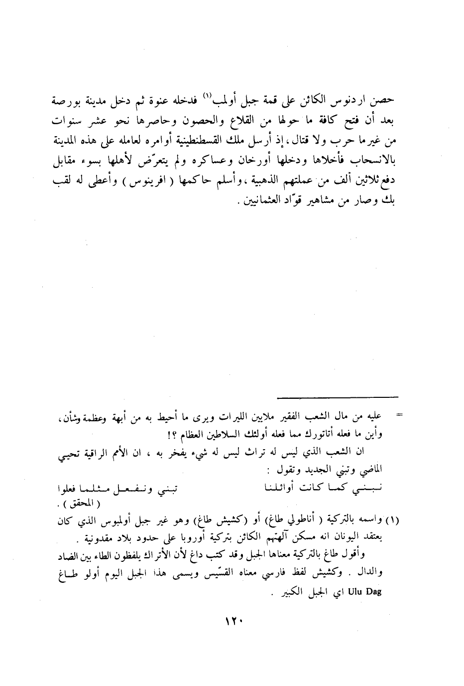 حصن اردنوس الْكَائِن على قمة جبل اولمب فدخله عنْوَة ثمَّ دخل مَدِينَة بورصة بعد ان فتح كَافَّة مَا حولهَا من القلاع والحصون وحاصرها نَحْو عشر سنوات من غيرما حَرْب وَلَا قتال اذ ارسل ملك الْقُسْطَنْطِينِيَّة اوامره لعامله على هَذِه الْمَدِينَة بالانسحاب فاخلاها ودخلها اورخان وعساكره وَلم يتَعَرَّض لاهلها بِسوء مُقَابل دفع ثَلَاثِينَ الف من عملتهم الذهبية واسلم حاكمها افرينوس واعطى لَهُ لقب بك وَصَارَ من مشاهير قواد العثمانين