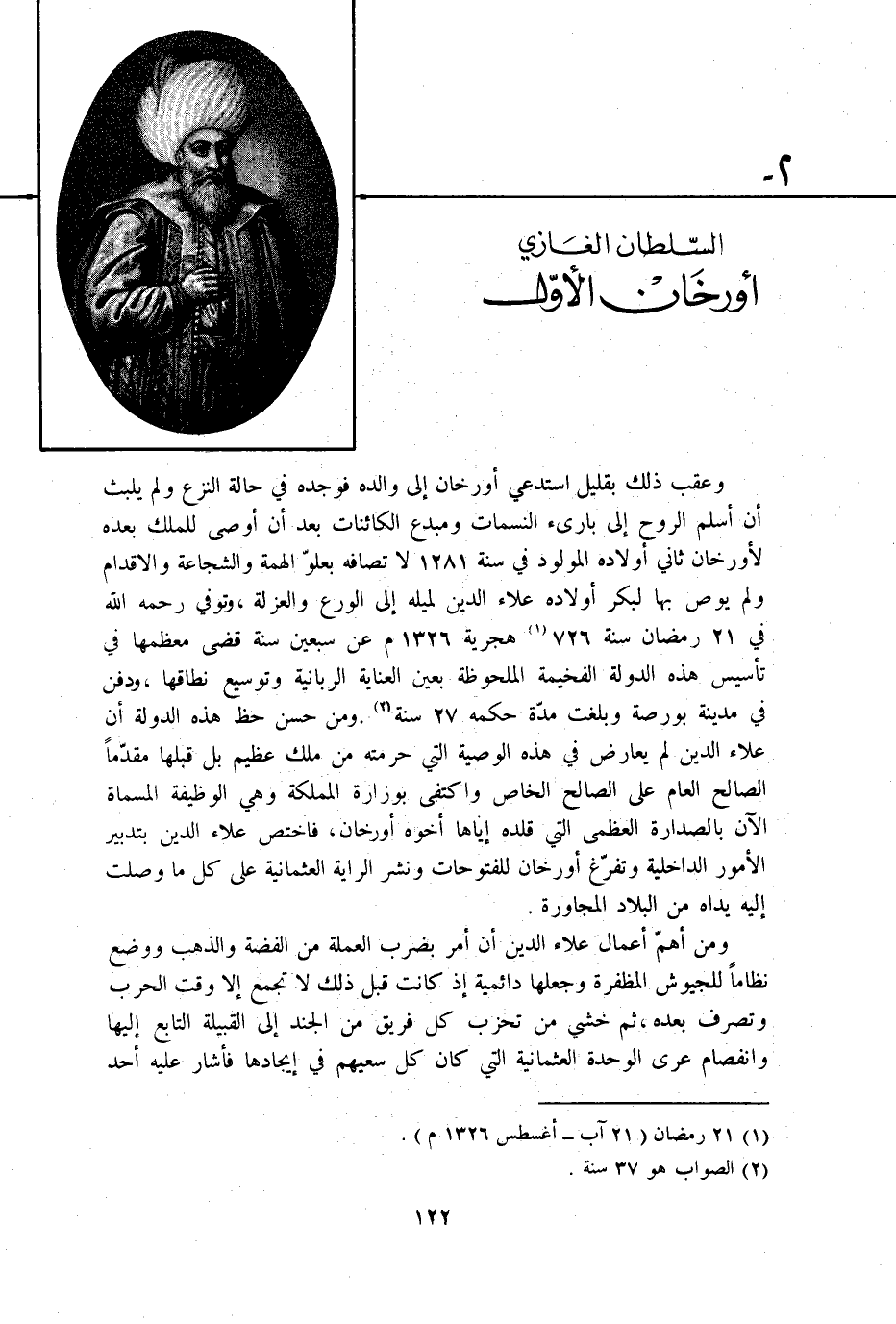وعقب ذَلِك بِقَلِيل استدعي اورخان إِلَى وَالِده فَوَجَدَهُ فِي حَالَة النزع وَلم يلبث ان اسْلَمْ الرّوح إِلَى بارئ النسمات ومبدع الكائنات بعد ان اوصى للْملك بعده لاورخان ثَانِي اولاده الْمَوْلُود فِي سنة 1281 م لاتصافه بعلو الهمة والشجاعة والاقدام وَلم يوص بهَا لبكر اولاده عَلَاء الدّين لميله إِلَى الْوَرع وَالْعُزْلَة وَتُوفِّي رَحمَه الله فِي 21 رَمَضَان سنة 726 هجرية 1326 م عَن سبعين سنة قضى معظمها فِي تأسيس هَذِه الدولة الفخيمة الملحوظة بِعَين الْعِنَايَة الربانية وتوسيع نطاقها وَدفن فِي مَدِينَة بورصة وَبَلغت مُدَّة حكمه 27 سنة وَمن حسن حَظّ هَذِه الدولة ان عَلَاء الدّين لم يُعَارض فِي هَذِه الْوَصِيَّة الَّتِي حرمته من ملك عَظِيم بل قبلهَا مقدما الصَّالح الْعَام على الصَّالح الْخَاص وَاكْتفى بوزارة المملكة وَهِي الْوَظِيفَة الْمُسَمَّاة الْآن بالصدارة الْعُظْمَى الَّتِي قَلّدهُ اياها اخوه اورخان فاختص عَلَاء الدّين بتدبير الامور الداخلية وتفرغ اورخان للفتوحات وَنشر الرَّايَة العثمانية على كل مَا وصلت اليه يَدَاهُ من الْبِلَاد الْمُجَاورَة
