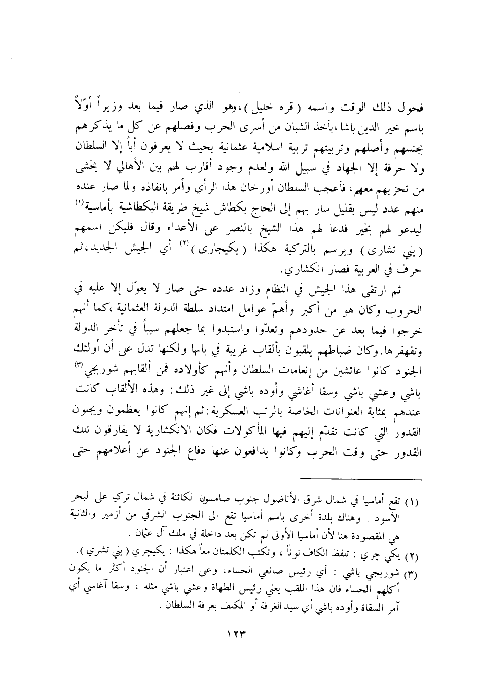 فحول ذَلِك الْوَقْت واسْمه قره خَلِيل وَهُوَ الَّذِي صَار فِيمَا بعد وزيرا اولا باسم خير الدّين باشا بِأخذ الشبَّان من اسرى الْحَرْب وفصلهم عَن كل مَا يذكرهم بجنسهم واصلهم وتربيتهم تربية اسلامية عثمانية بِحَيْثُ لَا يعْرفُونَ ابا الا السُّلْطَان وَلَا حِرْفَة الا الْجِهَاد فِي سَبِيل الله وَلعدم وجود اقارب لَهُم بَين الاهالي لَا يخْشَى من تحزبهم مَعَهم فاعجب السُّلْطَان اورخان هَذَا الرَّأْي وامر بانفاذه وَلما صَار عِنْده مِنْهُم عدد لَيْسَ بِقَلِيل سَار بهم إِلَى الْحَاج بكطاش شيخ طَريقَة البكطاشية باماسية ليدعو لَهُم بِخَير فَدَعَا لَهُم هَذَا الشَّيْخ بالنصر على الاعداء وَقَالَ فَلْيَكُن اسمهم يني تشارى ويرسم بالتركية هَكَذَا يكيجارى أَي الْجَيْش الْجَدِيد ثمَّ حرف فِي الْعَرَبيَّة فَصَارَ انكشاري