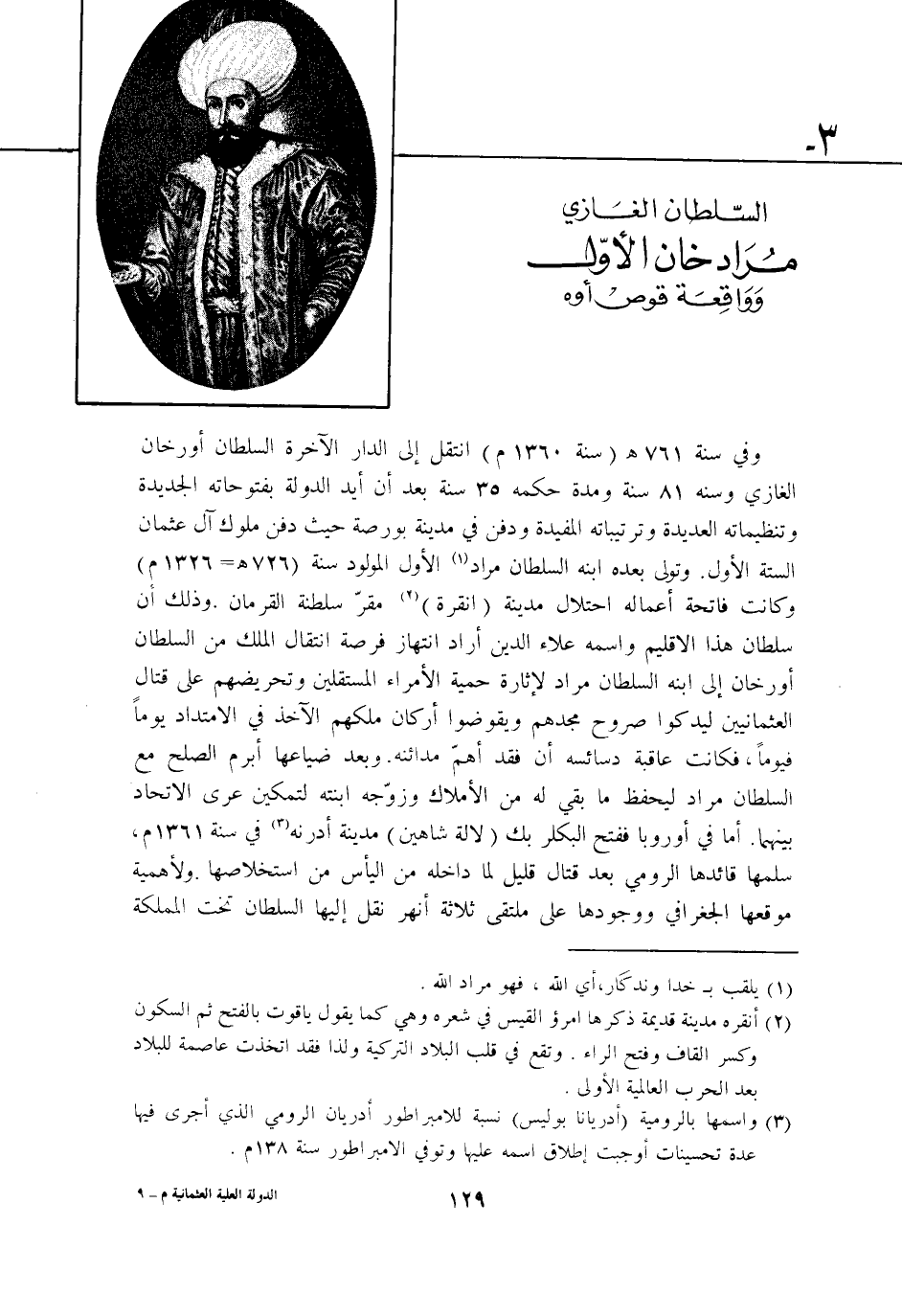 وَفِي سنة 761 هـ سنة 1360 انْتقل إِلَى الدَّار الْآخِرَة السُّلْطَان اورخان الْغَازِي وسنه 81 سنة وَمُدَّة حكمه 35 سنة بعد ان ايد الدولة بفتوحاته الجديدة وتنظيماته العديدة وترتيباته المفيدة وَدفن فِي مَدِينَة بورصة حَيْثُ دفن مُلُوك آل عُثْمَان السِّتَّة الاول وَتَوَلَّى بعده ابْنه السُّلْطَان مُرَاد الاول الْمَوْلُود سنة 726 هـ = 1326 م وَكَانَت فَاتِحَة اعماله احتلال مَدِينَة انقرة مقرّ سلطنة القرمان وَذَلِكَ ان سُلْطَان هَذَا الاقليم واسْمه عَلَاء الدّين اراد انتهاز فرْصَة انْتِقَال الْملك من السُّلْطَان اورخان إِلَى ابْنه السُّلْطَان مُرَاد لاثارة حمية الامراء المستقلين وتحريضهم على قتال العثمانيين ليدكوا صروح مجدهم ويقوضوا اركان ملكهم الْآخِذ فِي الامتداد يَوْمًا فيوما فَكَانَت عَاقِبَة دسائسه ان فقد اهم مدائنه وَبعد ضياعها ابرم الصُّلْح مَعَ السُّلْطَان مُرَاد ليحفظ مَا بَقِي لَهُ من الاملاك وزوجه ابْنَته لتمكين عرى الِاتِّحَاد بَينهمَا اما فِي اوروبا فَفتح البكلر بك لالة شاهين مَدِينَة ادرنه فِي سنة 1361 م سلمهَا قائدها الرُّومِي بعد قتال قَلِيل لما دَاخله من الْيَأْس من استخلاصها ولاهمية موقعها الجغرافي ووجودها على ملتقى ثَلَاثَة انهر نقل اليها السُّلْطَان تَحت المملكة