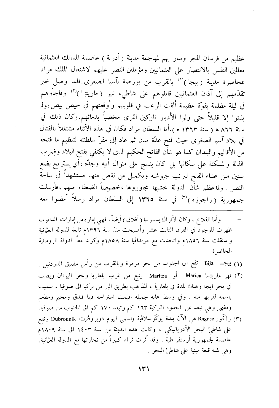 عَظِيم من فرسَان المجر وَسَار بهم لمهجمة مَدِينَة ادرنة عَاصِمَة الممالك العثمانية معللين النَّفس بالانتصار على العثمانيين ومؤملين النَّصْر عَلَيْهِم لاشتغال الْملك مُرَاد بمحاصرة مَدِينَة بيجا بِالْقربِ من بورصة بآسيا الصُّغْرَى فَلَمَّا وصل خبر تقدمهم إِلَى آذان العثمانيين قابلوهم على شاطيء نهر ماريتزا وفاجأوهم فِي لَيْلَة مظْلمَة بِقُوَّة عَظِيمَة القت الرعب فِي قُلُوبهم واوقعتهم فِي حيص بيص وَلم يَلْبَثُوا الا قَلِيلا حَتَّى ولوا الادبار تاركين الثرى مخضبا بدمائهم وَكَانَ ذَلِك فِي سنة 866 هـ سنة 1363 م اما السُّلْطَان مُرَاد فَكَانَ فِي هَذِه الاثناء مشتغلا بِالْقِتَالِ فِي بِلَاد آسيا الصُّغْرَى حَيْثُ فتح عدَّة مدن ثمَّ عَاد إِلَى مقرّ سلطنته لتنظيم مَا فَتحه من الاقاليم والبلدان كَمَا هُوَ شَأْن الفاتح الْحَكِيم الَّذِي لَا يَكْتَفِي بِفَتْح الْبِلَاد وَضرب الذلة والمسكنة على سكانها بل كَانَ ينسج على منوال ابيه وجده أَي يستريح بضع سِنِين من عناء الْفَتْح ليرتب جيوشه ويكمل من نقص مِنْهَا مستشهدا فِي ساحة النَّصْر وَلما عظم شَأْن الدولة خشيها مجاوروها خُصُوصا الضُّعَفَاء مِنْهُم فَأرْسلت جمهورية راجوزه فِي سنة 1365 إِلَى السُّلْطَان مُرَاد رسلًا امضوا مَعَه