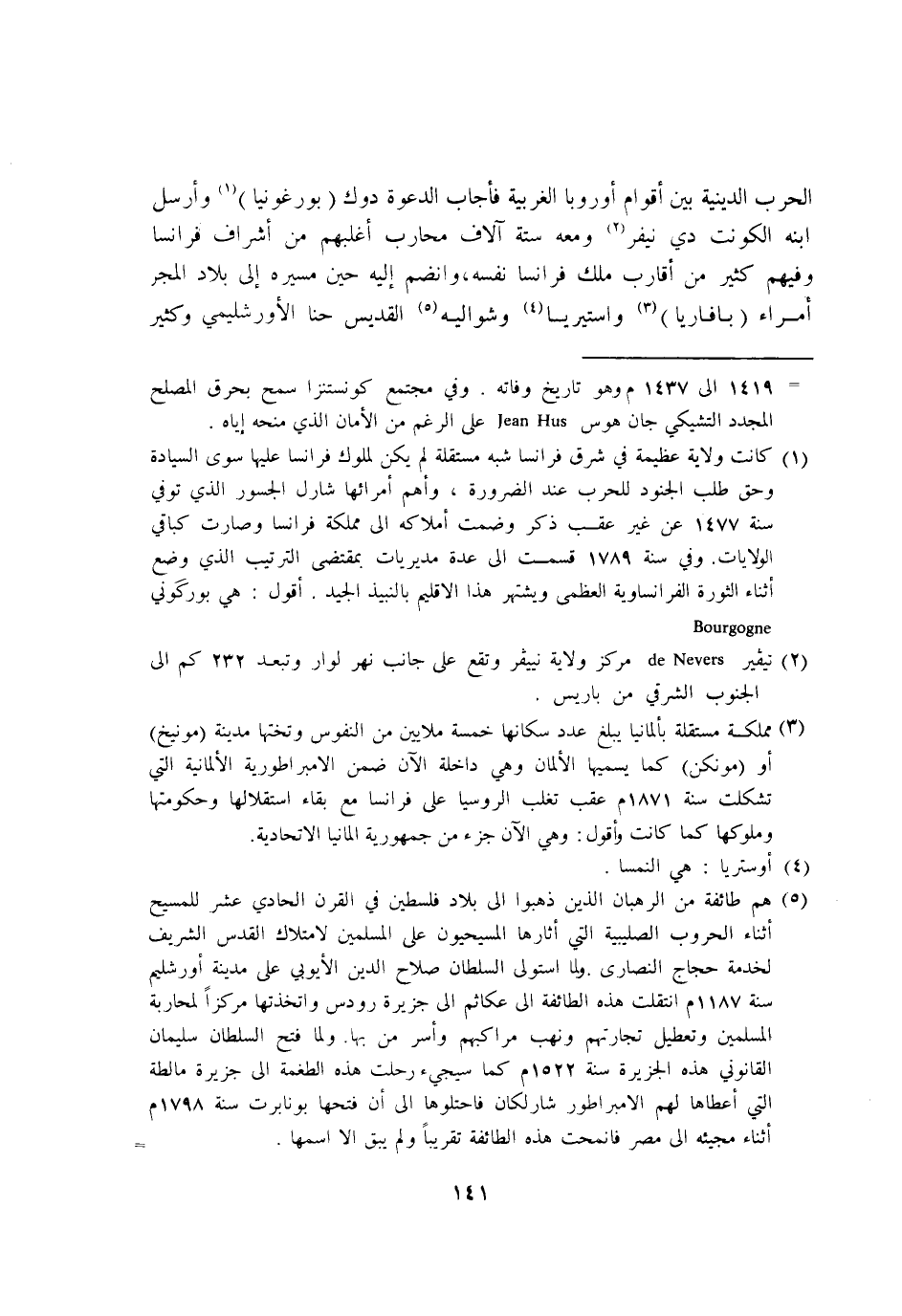 143 - الْحَرْب الدينيه بَين اقوام اوروبا الغربية فاجاب الدعْوَة دوك بورغونيا وارسل ابْنه الكونت دي نيفر وَمَعَهُ سِتَّة الاف محَارب اغلبهم من اشراف فرنسا وَفِيهِمْ كثير من اقارب ملك فرنسا نَفسه وانضم اليه حِين مسيره إِلَى بِلَاد المجر امراء بافاريا واستيريا وشواليه القديس حنا الاورشليمي وَكثير