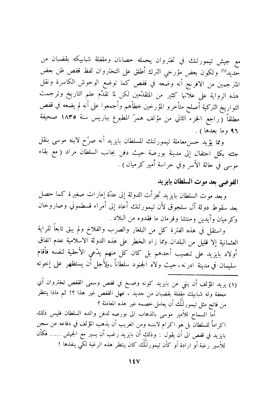 مَعَ جَيش تيمورلنك فِي تختروان يحملهُ حصانان ومقفلة شبابيكه بقضبان من حَدِيد وَلكَون بعض مؤرخي التّرْك اطلق على التختروان لفظ قفص ظن بعض المترجمين من الافرنج انه وَضعه فِي قفص كَمَا تُوضَع الوحوش الكاسرة وَنقل هَذِه الرِّوَايَة على علاتها كثير من الْمُتَقَدِّمين لَكِن لما تقدم علم التَّارِيخ وترجمت التواريخ التركية اصلح متأخرو المؤرخين خطأهم واجمعوا على انه لم يَضَعهُ فِي قفص مُطلقًا رَاجع الْجُزْء الثَّانِي من مؤلف همر المطبوع بباريس سنة 1835 صحيفَة 96 وَمَا بعْدهَا