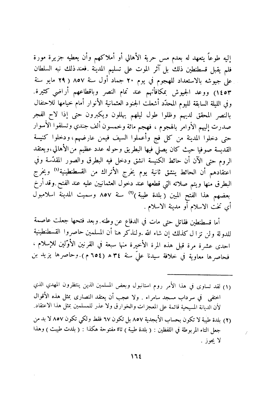 اليه طَوْعًا يتعهد لَهُ بِعَدَمِ مس حريَّة الاهالي اَوْ املاكهم وان يُعْطِيهِ جَزِيرَة مورة فَلم يقبل قسطنطين ذَلِك بل آثر الْمَوْت على تَسْلِيم الْمَدِينَة فَعِنْدَ ذَلِك نبه السُّلْطَان على جيوشه بالاستعداد للهجوم فِي يَوْم 20 جماد اول سنة 857 29 مايو سنة 1453 ووعد الجيوش بمكافأتهم عِنْد تَمام النَّصْر وباقطاعهم اراضي كَثِيرَة وَفِي اللَّيْلَة السَّابِقَة لليوم المحدد اشعلت الْجنُود العثمانية الانوار امام خيامها للاحتفال بالنصر الْمُحَقق لديهم وظلوا طول ليلهم يهللون وَيُكَبِّرُونَ حَتَّى إِذا لَاحَ الْفجْر صدرت اليهم الاوامر بالهجوم فهجم مائَة وَخَمْسُونَ الف جندي وتسلقوا الاسوار حَتَّى دخلُوا الْمَدِينَة من كل فج وَاعْمَلُوا السَّيْف فِيمَن عارضهم ودخلوا كَنِيسَة القديسة صوفيا حَيْثُ كَانَ يُصَلِّي فِيهَا البطريق وَحَوله عدد عَظِيم من الاهالي ويعتقد الرّوم حَتَّى الْآن ان حَائِط الْكَنِيسَة انْشَقَّ وَدخل فِيهِ البطرق والصور المقدسة وَفِي اعْتِقَادهم ان الْحَائِط ينشق ثَانِيَة يَوْم يخرج الاتراك من الْقُسْطَنْطِينِيَّة وَيخرج البطريق مِنْهَا وَيتم صلَاته الَّتِي قطعهَا عِنْد دُخُول العثمانيين عَلَيْهِ عِنْد الْفَتْح وَقد ارخ بَعضهم هَذَا الْفَتْح الْمُبين بَلْدَة طيبَة سنة 857 وَسميت الْمَدِينَة اسلامبول أَي تخت الاسلام اَوْ مَدِينَة الاسلام