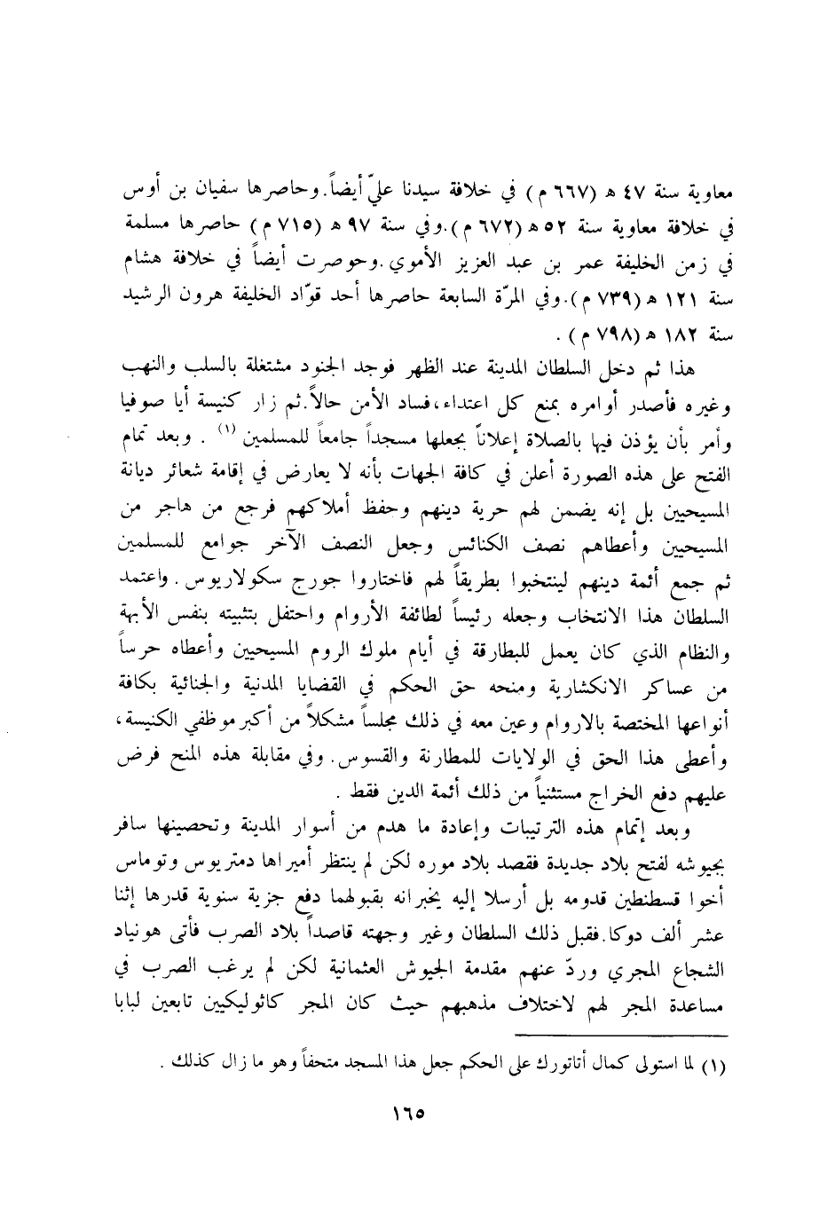 هَذَا ثمَّ دخل السُّلْطَان الْمَدِينَة عِنْد الظّهْر فَوجدَ الْجنُود مشتغلة بالسلب والنهب وَغَيره فاصدر اوامره بِمَنْع كل اعتداء فَسَاد الامن حَالا ثمَّ زار كَنِيسَة ايا صوفيا وامر بَان يُؤذن فِيهَا بِالصَّلَاةِ اعلانا بجعلها مَسْجِدا جَامعا للْمُسلمين وَبعد تَمام الْفَتْح على هَذِه الصُّورَة اعلن فِي كَافَّة الْجِهَات بانه لَا يُعَارض فِي اقامة شَعَائِر ديانَة المسيحيين بل انه يضمن لَهُم حريَّة دينهم وَحفظ املاكهم فَرجع من هَاجر من المسيحيين واعطاهم نصف الْكَنَائِس وَجعل النّصْف الآخر جَوَامِع لمسلمين ثمَّ جمع ائمة دينهم لينتخبوا بطريقا لَهُم فَاخْتَارُوا جورج سكولاريوس وَاعْتمد السُّلْطَان هَذَا الانتخاب وَجعله رَئِيسا لطائفة الاروام واحتفل بتثبيته بِنَفس الابهة والنظام الَّذِي كَانَ يعْمل للبطارقة فِي ايام مُلُوك الرّوم المسيحيين واعطاه حرسا من عَسَاكِر الانكشارية ومنحه حق الحكم فِي القضايا المدنية والجنائية بكافة انواعها المختصة بالاروام وَعين مَعَه فِي ذَلِك مَجْلِسا مُشكلا من اكبر موظفي الْكَنِيسَة واعطى هَذَا الْحق فِي الولايات للمطارنة والقسوس وَفِي مُقَابلَة هَذِه الْمنح فرض عَلَيْهِم دفع الْخراج مستثنيا من ذَلِك ائمة الدّين فَقَط