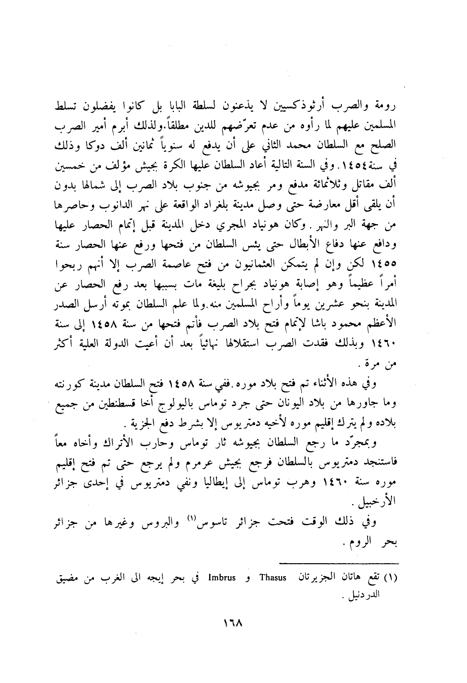رومة والصرب ارثوذكسيين لَا يذعنون لسلطة البابا بل كَانُوا يفضلون تسلط الْمُسلمين عَلَيْهِم لما راوه من عدم تعرضهم للدّين مُطلقًا وَلذَلِك ابرم امير الصرب الصُّلْح مَعَ السُّلْطَان مُحَمَّد الثَّانِي على ان يدْفع لَهُ سنويا ثَمَانِينَ الف دوكا وَذَلِكَ فِي سنة 1454 وَفِي السّنة التالية اعاد السُّلْطَان عَلَيْهَا الكرة بِجَيْش مؤلف من خمسين الف مقَاتل وثلاثمائة مدفع وَمر بجيوشه من جنوب بِلَاد الصرب إِلَى شمالها بِدُونِ ان يلقى اقل مُعَارضَة حَتَّى وصل مَدِينَة بلغراد الْوَاقِعَة على نهر الدانوب وحاصرها من جِهَة الْبر وَالنّهر وَكَانَ هونياد المجري دخل الْمَدِينَة قبل اتمام الْحصار عَلَيْهَا ودافع عَنْهَا دفاع الابطال حَتَّى يئس السُّلْطَان من فتحهَا وَرفع عَنْهَا الْحصار سنة 1455 لَكِن وان لم يتَمَكَّن العثمانيون من فتح عَاصِمَة الصرب الا انهم ربحوا امرا عَظِيما وَهُوَ اصابة هونياد بجراح بليغة مَاتَ بِسَبَبِهَا بعد رفع الْحصار عَن الْمَدِينَة بِنَحْوِ عشْرين يَوْمًا واراح الْمُسلمين مِنْهُ وَلما علم السُّلْطَان بِمَوْتِهِ ارسل الصَّدْر الاعظم مَحْمُود باشا لاتمام فتح بِلَاد الصرب فاتم فتحهَا من سنة 1458 إِلَى سنة 1460 وَبِذَلِك فقدت الصرب استقلالها نهائيا بعد ان اعيت الدولة الْعلية اكثر من مرّة