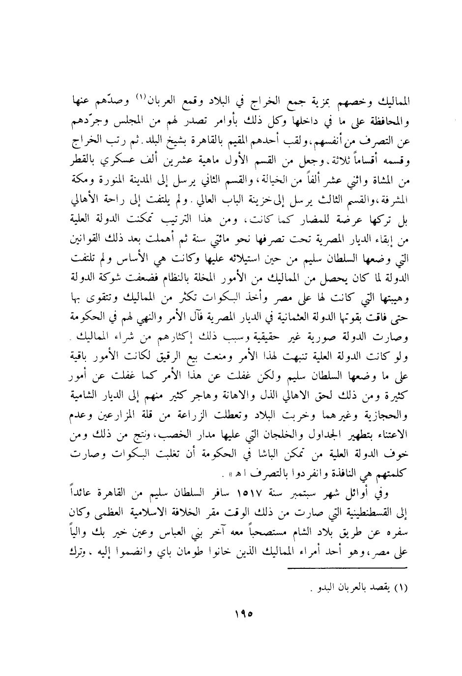 المماليك وخصهم بمزية جمع الْخراج فِي الْبِلَاد وقمع العربان وصدهم عَنْهَا والمحافظة على مَا فِي داخلها وكل ذَلِك بأوامر تصدر لَهُم من الْمجْلس وجردهم عَن التَّصَرُّف من انفسهم ولقب احدهم الْمُقِيم بِالْقَاهِرَةِ بشيخ الْبَلَد ثمَّ رتب الْخراج وقسمه اقساما ثَلَاثَة وَجعل من الْقسم الاول مَاهِيَّة عشْرين الف عسكري بالقطر من المشاة واثني عشر الْفَا من الخيالة وَالْقسم الثَّانِي يُرْسل إِلَى الْمَدِينَة المنورة وَمَكَّة المشرفة وَالْقسم الثَّالِث يُرْسل إِلَى خزينة الْبَاب العالي وَلم يلْتَفت إِلَى رَاحَة الاهالي بل تَركهَا عرضة للمضار كَمَا كَانَت وَمن هَذَا التَّرْتِيب تمكنت الدولة الْعلية من ابقاء الديار المصرية تَحت تصرفها نَحْو مِائَتي سنة ثمَّ اهملت بعد ذَلِك القوانين الَّتِي وَضعهَا السُّلْطَان سليم من حِين استيلائه عَلَيْهَا وَكَانَت هِيَ الاساس وَلم تلْتَفت الدولة لما كَانَ يحصل من المماليك من الامور المخلة بالنظام فضعفت شَوْكَة الدولة وهيبتها الَّتِي كَانَت لَهَا على مصر واخذ البكوات تكْثر من المماليك وتتقوى بهَا حَتَّى فاقت بقوتها الدولة العثمانية فِي الديار المصرية فآل الامر وَالنَّهْي لَهُم فِي الْحُكُومَة وَصَارَت الدولة صورية غير حَقِيقِيَّة وَسبب ذَلِك اكثارهم من شِرَاء المماليك وَلَو كَانَت الدولة الْعلية تنبهت لهَذَا الامر ومنعت بيع الرَّقِيق لكَانَتْ الامور بَاقِيَة على مَا وَضعهَا السُّلْطَان سليم وَلَكِن غفلت عَن هَذَا الامر كَمَا غفلت عَن امور كَثِيرَة وَمن ذَلِك لحق الاهالي الذل والاهانة وَهَاجَر كثير مِنْهُم إِلَى الديار الشامية والحجازية وَغَيرهمَا وَخَربَتْ الْبِلَاد وتعطلت الزِّرَاعَة من قلَّة المزارعين وَعدم الاعتناء بتطهير الجداول والخلجان الَّتِي عَلَيْهَا مدَار الخصب ونتج من ذَلِك وَمن خوف الدولة الْعلية من تمكن الباشا فِي الْحُكُومَة ان تغلبت البكوات وَصَارَت كلمتهم هِيَ النافذة وانفردوا بِالتَّصَرُّفِ اهـ