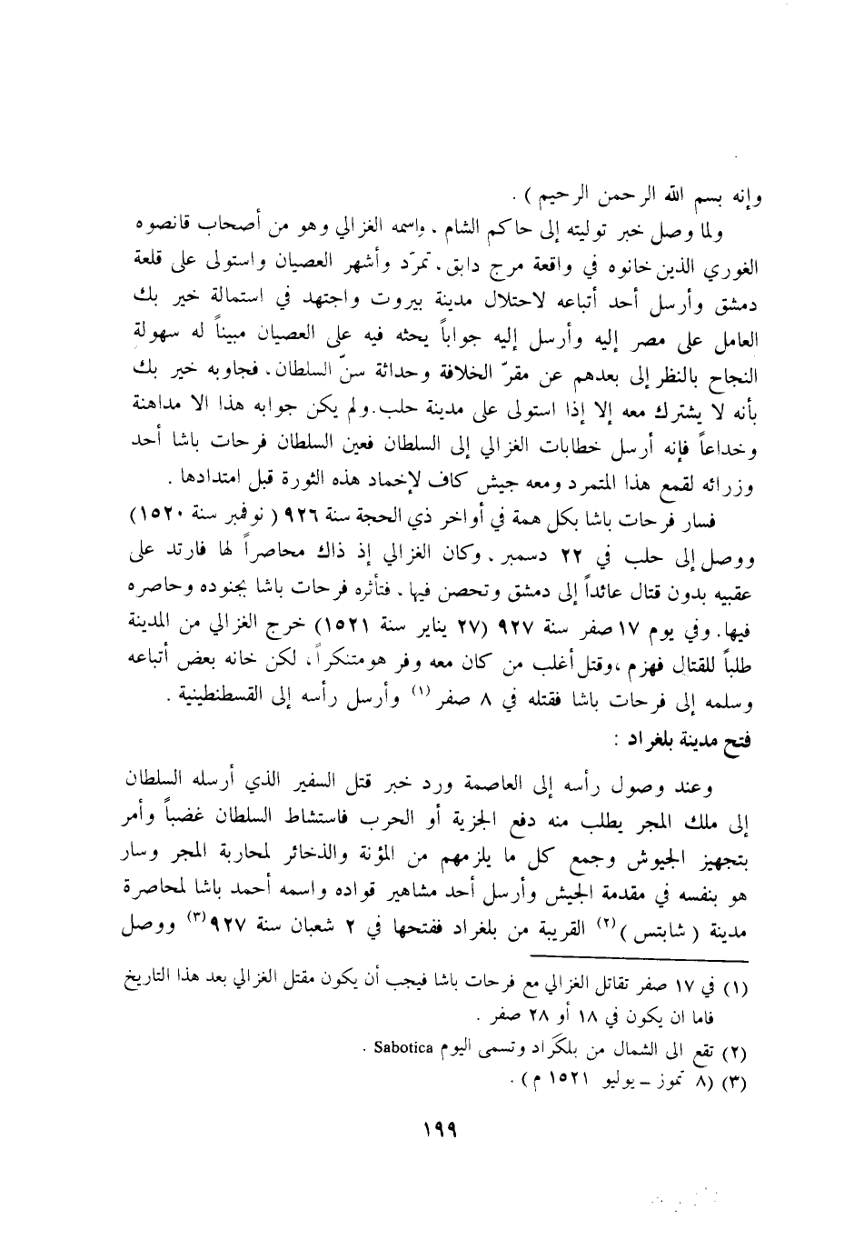 فَسَار فرحات باشا بِكُل همة فِي اواخر ذِي الْحجَّة سنة 926 نوفمبر سنة 1520 وَوصل إِلَى حلب فِي 22 دسمبر وَكَانَ الْغَزالِيّ اذ ذَاك محاصرا لَهَا فَارْتَد على عَقِبَيْهِ بِدُونِ قتال عَائِدًا إِلَى دمشق وتحصن فِيهَا فتاثره فرحات باشا بجُنُوده وحاصره فِيهَا وَفِي يَوْم 17 صفر سنة 927 27 يناير سنة 1521 خرج الْغَزالِيّ من الْمَدِينَة طلبا لِلْقِتَالِ فَهزمَ وَقتل اغلب من كَانَ مَعَه وفر هُوَ متنكرا لَكِن خانه بعض اتِّبَاعه وَسلمهُ إِلَى فرحات باشا فَقتله فِي 8 صفر وارسل راسه إِلَى الْقُسْطَنْطِينِيَّة