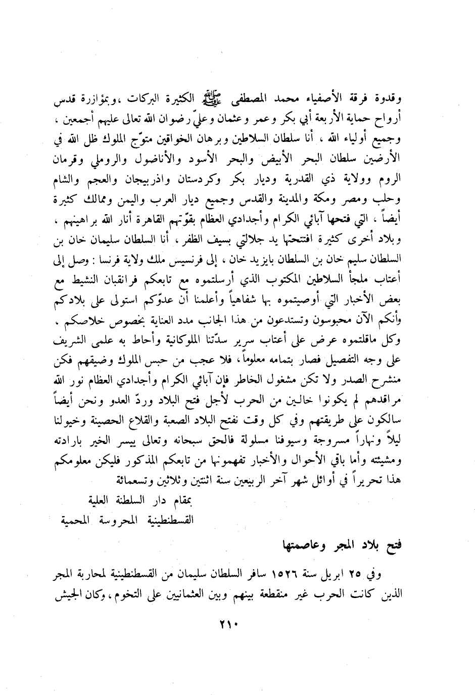 وقدوة فرقة الاصفياء مُحَمَّد الْمُصْطَفى صلى الله عَلَيْهِ وَسلم الْكَثِيرَة البركات وبمؤازرة قدس ارواح حماية الاربعة ابي بكر وَعمر وَعُثْمَان وَعلي رضوَان الله تَعَالَى عَلَيْهِم اجمعين وَجَمِيع اولياء الله انا سُلْطَان السلاطين وبرهان الخواقين متوج الْمُلُوك ظلّ الله فِي الارضين سُلْطَان الْبَحْر الابيض وَالْبَحْر الاسود والاناضول والروملي وقرمان الرّوم وَولَايَة ذِي الْقَدَرِيَّة وديار بكر وكردستان واذربيجان والعجم وَالشَّام وحلب ومصر وَمَكَّة وَالْمَدينَة والقدس وَجَمِيع ديار الْعَرَب واليمن وممالك كَثِيرَة ايضا الَّتِي فتحهَا آبَائِي الْكِرَام واجدادي الْعِظَام بقوتهم الْقَاهِرَة انار الله براهينهم وبلاد اخرى كَثِيرَة افتتحتها يَد جلالتي بِسيف الظفر انا السُّلْطَان سُلَيْمَان خَان بن السُّلْطَان سليم خَان بن السُّلْطَان بايزيد خَان إِلَى فرنسيس ملك ولَايَة فرنسا وصل إِلَى اعتاب ملْجأ السلاطين الْمَكْتُوب الَّذِي ارسلتموه مَعَ تابعكم فرانقبان النشيط مَعَ بعض الاخبار الَّتِي اوصيتموه بهَا شفاهيا واعلمنا ان عَدوكُمْ استولى على بِلَادكُمْ وانكم الْآن محبوسون وتستدعون من هَذَا الْجَانِب مدد الْعِنَايَة بِخُصُوص خلاصكم وكل ماقلتموه عرض على اعتاب سَرِير سدتنا الملوكانية واحاط بِهِ علمى الشريف على وَجه التَّفْصِيل فَصَارَ بِتَمَامِهِ مَعْلُوما فَلَا عجب من حبس الْمُلُوك وضيقهم فَكُن منشرح الصَّدْر وَلَا تكن مَشْغُول الخاطر فان آبَائِي الْكِرَام واجدادي الْعِظَام نور الله مراقدهم لم يَكُونُوا خالين من الْحَرْب لاجل فتح الْبِلَاد ورد الْعَدو وَنحن أَيْضا سالكون على طريقتهم وَفِي كل وَقت نفتح الْبِلَاد الصعبة والقلاع الحصينة وخيولنا لَيْلًا وَنَهَارًا مسروجة وسيوفنا مسلولة فَالْحق سُبْحَانَهُ وَتَعَالَى ييسر الْخَيْر بارادته ومشيئته واما بَاقِي الاحوال والاخبار تفهمونها من تابعكم الْمَذْكُور فَلْيَكُن معلومكم هَذَا تحريرا فِي اوائل شهر آخر الربيعين سنة اثْنَتَيْنِ وَثَلَاثِينَ وَتِسْعمِائَة بمقام دَار السلطنة الْعلية الْقُسْطَنْطِينِيَّة المحروسة المحمية