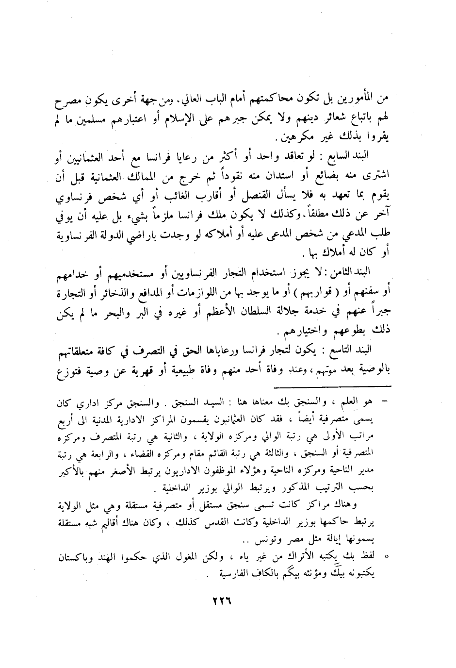 البند السَّابِع لَو تعاقد وَاحِد اَوْ اكثر من رعايا فرانسا مَعَ اُحْدُ العثمانيين اَوْ اشْترى مِنْهُ بضائع اَوْ اسْتَدَانَ مِنْهُ نقودا ثمَّ خرج من الممالك العثمانية قبل ان يقوم بِمَا تعهد بِهِ فَلَا يسال القنصل اَوْ اقارب الْغَائِب اَوْ أَي شخص فرنساوي آخر عَن ذَلِك مُطلقًا وَكَذَلِكَ لَا يكون ملك فرانسا ملزما بِشَيْء بل عَلَيْهِ ان يُوفي طلب الْمُدَّعِي من شخص الْمُدعى عَلَيْهِ اَوْ املاكه لَو وجدت باراضي الدولة الفرنساوية اَوْ كَانَ لَهُ املاك بهَا