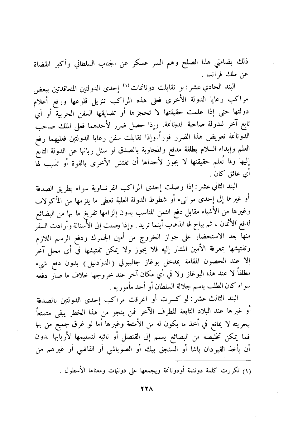 البند الْحَادِي عشر لَو تقابلت دونانمات احدى الدولتين المتعاقدتين بِبَعْض مراكب رعايا الدولة الاخرى فعلى هَذِه المراكب تَنْزِيل قلوعها وَرفع اعلام دولتها حَتَّى اذا علمت حَقِيقَتهَا لَا تحجزها اَوْ تضايقها السفن الحربية اَوْ أَي تَابع اخر للدولة صَاحِبَة الدونانمة واذا حصل ضَرَر لاحدهما فعلى الْملك صَاحب الدونانمة تعويض هَذَا الضَّرَر فَوْرًا واذا تقابلت سفن رعايا الدولتين فعلَيْهِمَا رفع الْعلم وابداء السَّلَام بِطَلْقَة مدفع والمجاوبة بِالصّدقِ لَو سُئِلَ ربانها عَن الدولة التَّابِع اليها وَلما تعلم حَقِيقَتهَا لَا يجوز لاحداها ان تفتش الاخرى بِالْقُوَّةِ اَوْ تسبب لَهَا أَي عائق كَانَ