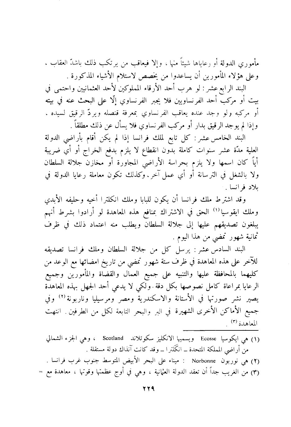 وَقد اشْترط ملك فراسنا ان يكون للبابا وَملك انكلترا اخيه وَحَلِيفه الابدي وَملك ايقوسيا الْحق فِي الِاشْتِرَاك بمنافع هَذِه المعاهدة لَو ارادوا بِشَرْط انهم يبلغون تصديقهم عَلَيْهَا الى جلالة السُّلْطَان وَيطْلب مِنْهُ اعْتِمَاد ذَلِك فِي ظرف ثَمَانِيَة شهور تمْضِي من هَذَا الْيَوْم
