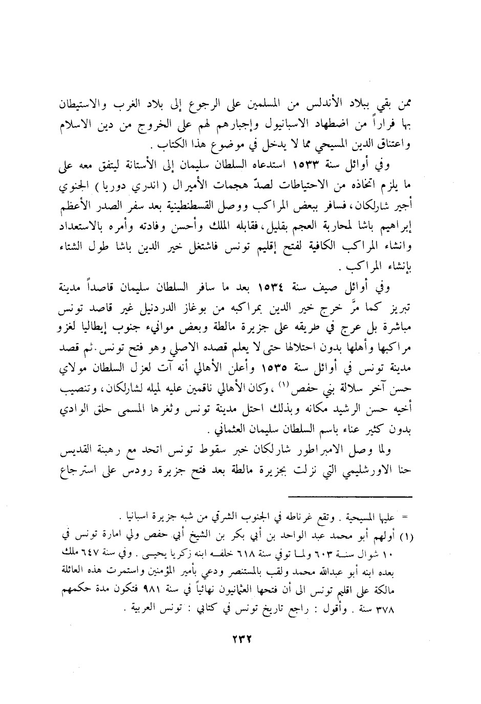 وَفِي اوائل صيف سنة 1534 بعد مَا سَافر السُّلْطَان سُلَيْمَان قَاصِدا مَدِينَة تبريز كَمَا مر خرج خير الدّين بمراكبه من بوغاز الدردنيل غير قَاصد تونس مُبَاشرَة بل عرج فِي طَرِيقه على جَزِيرَة مالطة وَبَعض موانيء جنوب ايطاليا لغزو مراكبها واهلها بِدُونِ احتلالها حَتَّى لَا يعلم قَصده الاصلي وَهُوَ فتح تونس ثمَّ قصد مَدِينَة تونس فِي اوائل سنة 1535 واعلن الاهالي انه آتٍ لعزل السُّلْطَان مولَايَ حسن آخر سلالة بني حَفْص وَكَانَ الاهالي ناقمين عَلَيْهِ لميله لشارلكان وتنصيب اخيه حسن الرشيد مَكَانَهُ وَبِذَلِك احتل مَدِينَة تونس وثغرها الْمُسَمّى حلق الْوَادي بِدُونِ كثير عناء باسم السُّلْطَان سُلَيْمَان العثماني