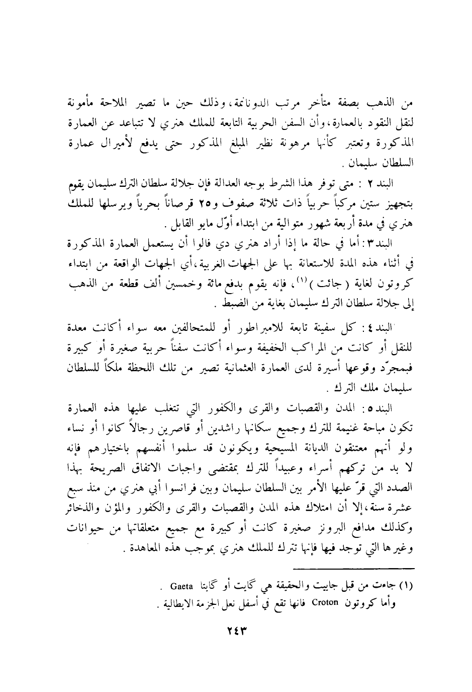 البند 3 اما فِي حَالَة مَا إِذا اراد هنري دي فالوا ان يسْتَعْمل الْعِمَارَة الْمَذْكُورَة فِي اثناء هَذِه الْمدَّة للاستعانة بهَا على الْجِهَات الغربية أَي الْجِهَات الْوَاقِعَة من ابْتِدَاء كروتون لغاية جائت فانه يقوم بِدفع مائَة وَخمسين الف قِطْعَة من الدهب إِلَى جلالة سُلْطَان التّرْك سُلَيْمَان بغاية من الضَّبْط
