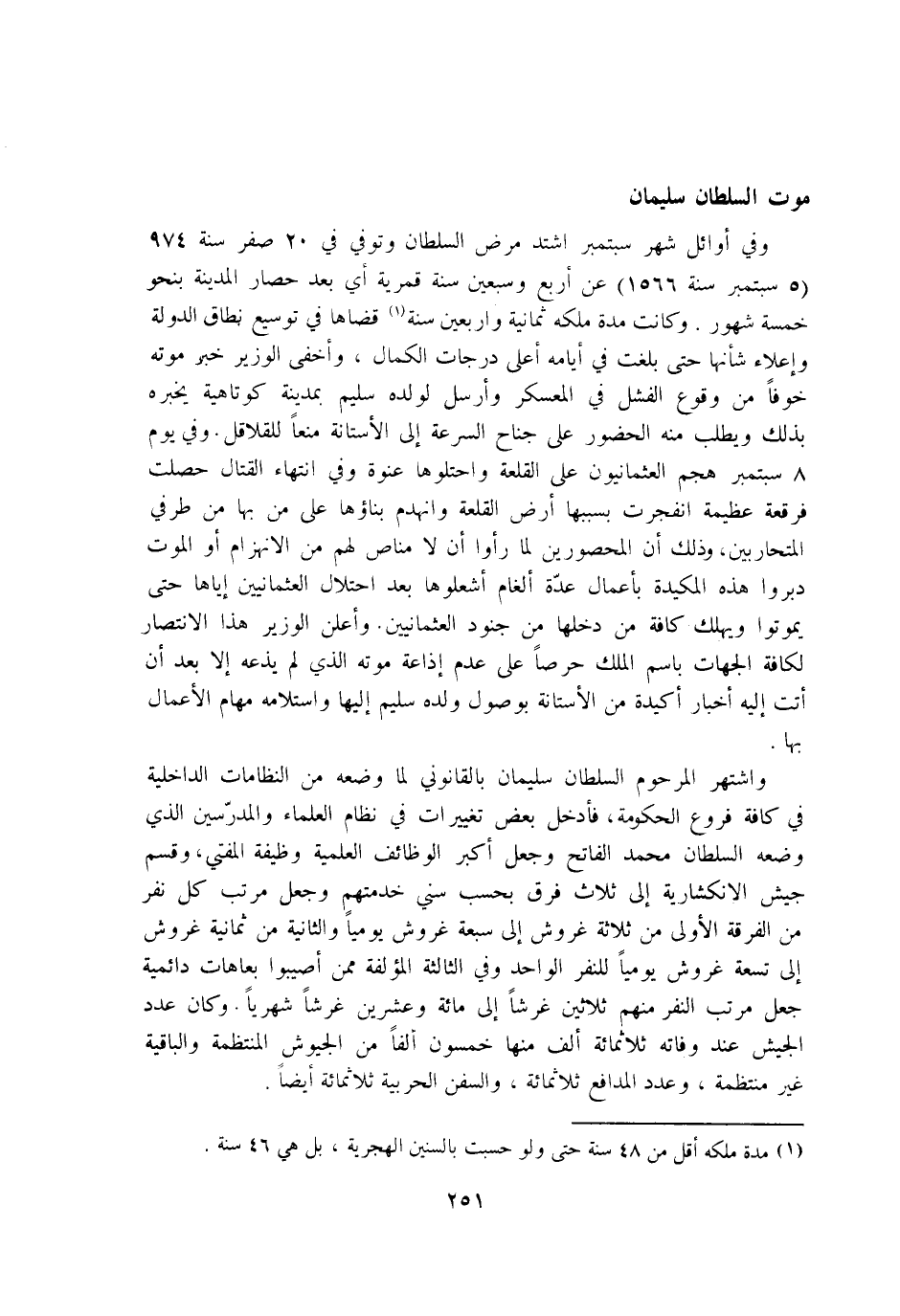 وَفِي اوائل شهر سبتمبر اشْتَدَّ مرض السُّلْطَان وَتُوفِّي فِي 20 صفر سنة 974 5 سبتمبر سنة 1566 عَن ارْبَعْ وَسبعين سنة قمرية أَي بعد حِصَار الْمَدِينَة بِنَحْوِ خَمْسَة شهور وَكَانَت مُدَّة ملكه ثَمَانِيَة واربعين سنة قَضَاهَا فِي توسيع نطاق الدولة واعلاء شانها حَتَّى بلغت فِي ايامه اعلى دَرَجَات الْكَمَال واخفى الْوَزير خبر مَوته خوفًا من وُقُوع الفشل فِي المعسكر وارسل لوَلَده سليم بِمَدِينَة كوتاهية يُخبرهُ بذلك وَيطْلب مِنْهُ الْحُضُور على جنَاح السرعة إِلَى الاستانة منعا للقلاقل وَفِي يَوْم 8 سبتمبر هجم العثمانيون على القلعة واحتلوها عنْوَة وَفِي انْتِهَاء الْقِتَال حصلت فرقعة عَظِيمَة انفجرت بِسَبَبِهَا ارْض القلعة وانهدم بناؤها على من بهَا من طرفِي المتحاربين وَذَلِكَ ان المحصورين لما راوا ان لَا مناص لَهُم من الانهزام اَوْ الْمَوْت دبروا هَذِه المكيدة باعمال عدَّة الغام اشعلوها بعد احتلال العثمانيين اياها حَتَّى يموتوا وَيهْلك كَافَّة من دَخلهَا من جنود العثمانيين واعلن الْوَزير هَذَا الِانْتِصَار لكافة الْجِهَات باسم الْملك حرصا على عدم اذاعة مَوته الَّذِي لم يذعه الا بعد ان اتت اليه اخبار اكيدة من الاستانة بوصول وَلَده سليم اليها واستلامه مهام الاعمال بهَا
