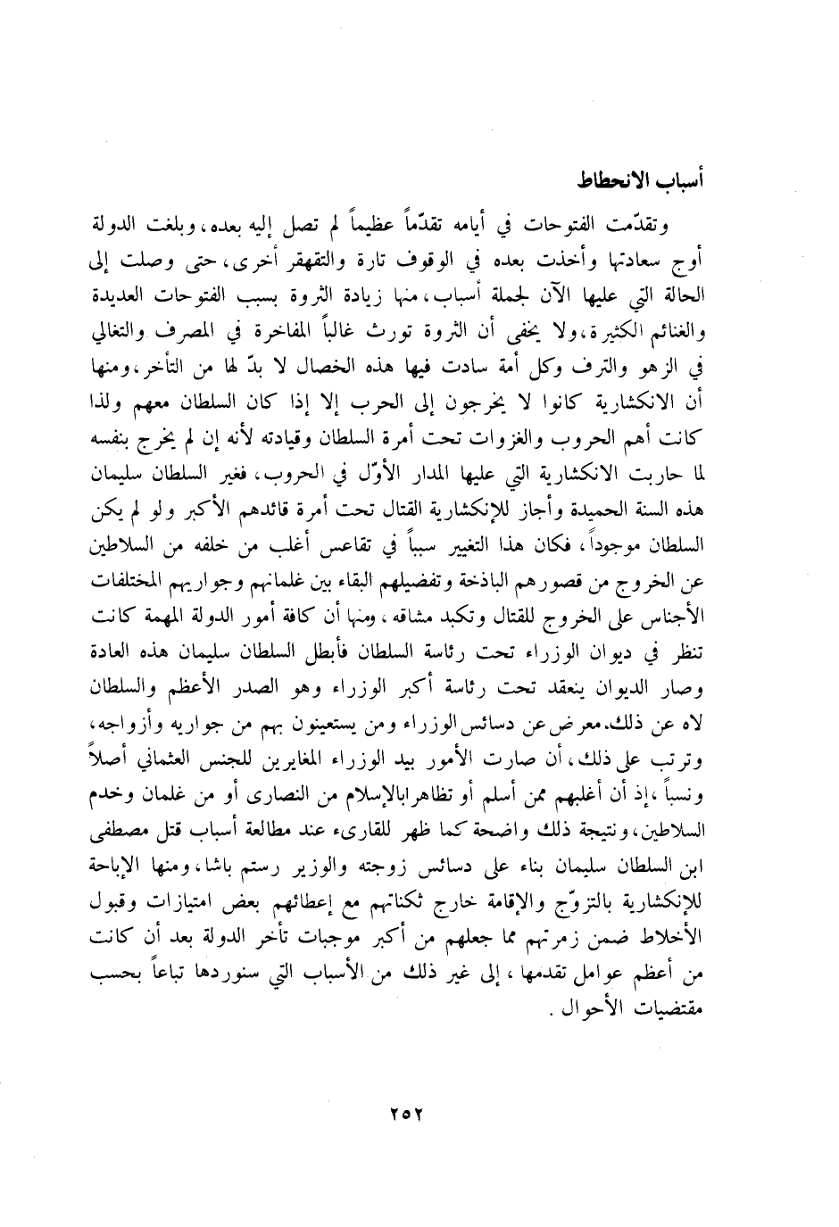 وَتَقَدَّمت الفتوحات فِي ايامه تقدما عَظِيما لم تصل اليه بعده وَبَلغت الدولة اوج سعادتها واخذت بعده فِي الْوُقُوف تَارَة والتقهقر اخرى حَتَّى وصلت إِلَى الْحَالة الَّتِي عَلَيْهَا الان لجملة اسباب مِنْهَا زِيَادَة الثروة بِسَبَب الفتوحات العديدة والغنائم الْكَثِيرَة وَلَا يخفى ان الثروة تورث غَالِبا الْمُفَاخَرَة فِي الْمصرف والتغالي فِي الزهو والترف وكل امة سادت فِيهَا هَذِه الْخِصَال لَا بُد لَهَا من التَّأَخُّر وَمِنْهَا ان الانكشارية كَانُوا لَا يخرجُون إِلَى الْحَرْب الا إِذا كَانَ السُّلْطَان مَعَهم وَلذَا كَانَت اهم الحروب والغزوات تَحت امرة السُّلْطَان وقيادته لانه ان لم يخرج بِنَفسِهِ لما حَارَبت الانكشارية الَّتِي عَلَيْهَا الْمدَار الاول فِي الحروب فَغير السُّلْطَان سُلَيْمَان هَذِه السّنة الحميدة واجاز للانكشارية الْقِتَال تَحت امرة قائدهم الاكبر وَلَو لم يكن السُّلْطَان مَوْجُودا فَكَانَ هَذَا التَّغْيِير سَببا فِي تقاعس اغلب من خَلفه من السلاطين عَن الْخُرُوج من قصورهم الباذخة وتفضيلهم الْبَقَاء بَين غلمانهم وجواريهم المختلفات الاجناس على الْخُرُوج لِلْقِتَالِ وتكبد مشاقه وَمِنْهَا ان كَافَّة امور الدولة المهمة كَانَت تنظر فِي ديوَان الوزراء تَحت رئاسة السُّلْطَان فابطل السُّلْطَان سُلَيْمَان هَذِه الْعَادة وَصَارَ الدِّيوَان ينْعَقد تَحت رئاسة اكبر الوزراء وَهُوَ الصَّدْر الاعظم وَالسُّلْطَان لاه عَن ذَلِك معرض عَن دسائس الوزراء وَمن يستعينون بهم من جواريه وازواجه وترتب على ذَلِك ان صَارَت الامور بيد الوزراء المغايرين للْجِنْس العثماني اصلا ونسبا اذ ان اغلبهم مِمَّن اسْلَمْ اَوْ تظاهر بالاسلام من النَّصَارَى اَوْ من غلْمَان وخدم السلاطين ونتيجة ذَلِك وَاضِحَة كَمَا ظهر للقارئ عِنْد مطالعة اسباب قتل مصطفى ابْن السُّلْطَان سُلَيْمَان بِنَاء على دسائس زَوجته والوزير رستم باشا وَمنا الاباحة للانكشارية بالتزوج والاقامة خَارج ثكناتهم مَعَ اعظائهم بعض امتيازات وَقبُول الاخلاط ضمن زمرتهم مِمَّا جعلهم من اكبر مُوجبَات تَأَخّر الدولة بعد ان كَانَت من اعظم عوامل تقدمها إِلَى غير ذَلِك من الاسباب الَّتِي سنوردها تباعا بِحَسب مقتضيات الاحوال