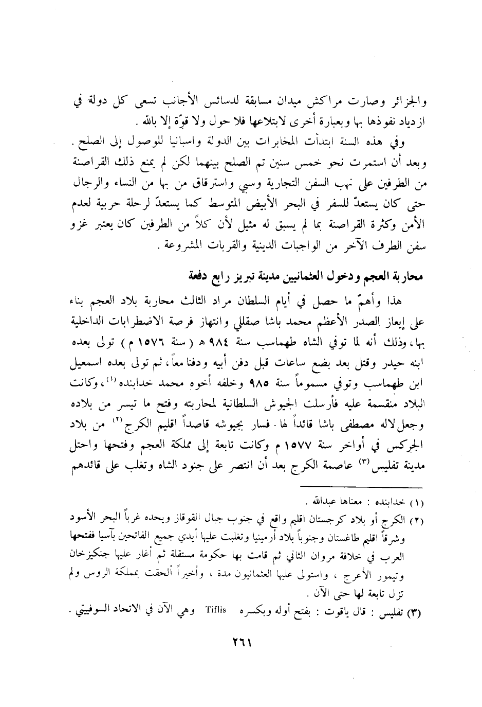 هَذَا واهم مَا حصل فِي ايام السُّلْطَان مُرَاد الثَّالِث محاربة بِلَاد الْعَجم بِنَاء على ايعاز الصَّدْر الاعظم مُحَمَّد باشا صقللي وانتهاز فرْصَة الاضطرابات الداخلية بهَا وَذَلِكَ انه لما توفّي الشاه طهماسب سنة 984 هـ سنة 1576 م تولى بعده ابْنه حيدر وَقتل بعد بضع سَاعَات قبل دفن ابيه ودفنا مَعًا ثمَّ تولى بعده اسماعيل ابْن طهماسب وَتُوفِّي مسموما سنة 985 وَخَلفه اخوه محمدد خدابنده وَكَانَت الْبِلَاد منقسمة عَلَيْهِ فارسلت الجيوش السُّلْطَانِيَّة لمحاربته وَفتح مَا تيَسّر من بِلَاده وَجعل لاله مصطفى باشا قائدا لَهَا فَسَار بجيوشه قَاصِدا اقليم الكرج من بِلَاد الجركس فِي اواخر سنة 1577 م وَكَانَت تَابِعَة إِلَى مملكة الْعَجم وَفتحهَا واحتل مَدِينَة تفليس عَاصِمَة الكرج بعد ان انتصر على جنود الشاه وتغلب على قائدهم