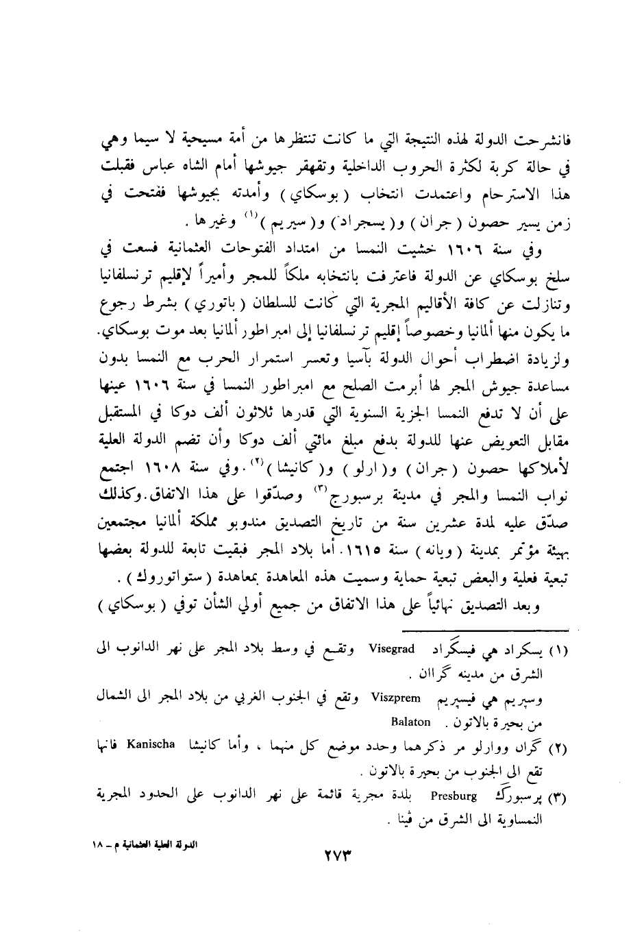 وَفِي سنة 1606 خشيت النمسا من امتداد الفتوحات العثمانية فسعت فِي سلخ بوسكاي عَن الدولة فَاعْترفت بانتخابه ملكا للمجر واميرا لاقليم ترنسلفانيا وتنازلت عَن كَافَّة الاقاليم المجرية الَّتِي كَانَت للسُّلْطَان باتوري بِشَرْط رُجُوع مَا يكون مِنْهَا المانيا وخصوصا اقليم ترنسلفانيا إِلَى امبراطور المانيا بعد موت بوسكاي ولزيادة اضْطِرَاب احوال الدولة بآسيا وتعسر اسْتِمْرَار الْحَرْب مَعَ النمسا بِدُونِ مساعدة جيوش المجر لَهَا ابرمت الصُّلْح مَعَ امبراطور النمسا فِي سنة 1606 عينهَا على ان لَا تدفع النمسا الْجِزْيَة السنوية الَّتِي قدرهَا ثَلَاثُونَ الف دوكا فِي الْمُسْتَقْبل مُقَابل التعويض عَنْهَا للدولة بِدفع مبلغ مِائَتي الف دوكا وان تضم الدولة الْعلية لاملاكها حصون جران وارلو وكانيشا وَفِي سنة 1608 اجْتمع نواب النمسا والمجر فِي مَدِينَة برسبورج وَصَدقُوا عل هَذَا الِاتِّفَاق وَكَذَلِكَ صدق عَلَيْهِ لمُدَّة عشْرين سنة من تَارِيخ التَّصْدِيق مندوبو مملكة المانيا مُجْتَمعين بهيئة مؤتمر بِمَدِينَة ويانه سنة 1615 اما بِلَاد المجر فَبَقيت تَابِعَة للدولة بَعْضهَا تَبَعِيَّة فعلية وَالْبَعْض تَبَعِيَّة حماية وَسميت هَذِه المعاهدة بمعاهدة ستواتوروك