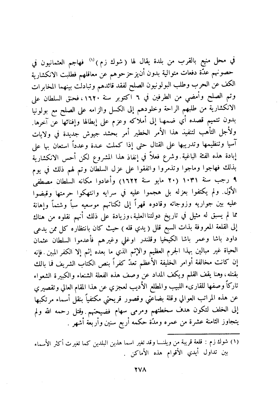 فِي مَحل منيع بِالْقربِ من بَلْدَة يُقَال لَهَا شوك زم فهاجم العثمانون فِي حصونهم عدَّة دفعات مُتَوَالِيَة بِدُونِ ان يزحزحوهم عَن معاقلهم قطلبت الانكشارية الْكَفّ عَن الْحَرْب وَطلب البولونيون الصُّلْح لفقد قائدهم وتبادلت بَينهمَا المخابرات وَتمّ الصُّلْح وامضي من الطَّرفَيْنِ فِي 6 اكتوبر سنة 1620 فحنق السُّلْطَان على الانكشارية من طَلَبهمْ الرَّاحَة وخلودهم إِلَى الكسل والزامه على الصُّلْح مَعَ بولونيا بِدُونِ تتميم قَصده أَي ضمهَا إِلَى املاكه وعزم على ابطالها وافنائها عَن آخرهَا ولاجل التأهب لتنفيذ هَذَا الامر الخطير امْر بحشد جيوش جَدِيدَة فِي ولايات آسيا وتنظيمها وتدريبها على الْقِتَال حَتَّى إِذا كملت عدَّة وعددا اسْتَعَانَ بهَا على ابادة هَذِه الفئة الباغية وَشرع فعلا فِي انفاذ هَذَا الْمَشْرُوع لَكِن احس الانكشارية بذلك فهاجوا وماجوا وتذمروا وَاتَّفَقُوا على غزل السُّلْطَان وَتمّ لَهُم ذَلِك فِي يَوْم 9 رَجَب سنة 1031 20 مايو سنة 1622 واعادوا مَكَانَهُ السُّلْطَان مصطفى الاول وَلم يكتفوا بعزله بل هجموا عَلَيْهِ فِي سرايه وانتهكوا حرمتهَا وقبضوا عَلَيْهِ بَين جواريه وزوجاته وقادوه قهرا إِلَى ثكناتهم موسعيه سبا وشتما واهانة مِمَّا لم يسْبق لَهُ مثيل فِي تَارِيخ دولتنا الْعلية وَزِيَادَة على ذَلِك انهم نقلوه من هُنَاكَ إِلَى القلعة الْمَعْرُوفَة بِذَات السَّبع قلل يَدي قله حَيْثُ كَانَ بانتظاره كل مِمَّن يدعى دَاوُد باشا وَعمر باشا الكيخيا وقلندر اوغلى وَغَيرهم فاعدموا السُّلْطَان عُثْمَان لحياة غير مبالين بِهَذَا الجرم الْعَظِيم والاثم الَّذِي مَا بعده اثم الا الْكفْر الْمُبين فانه ان كَانَت مُخَالفَة اوامر الْخَلِيفَة الاعظم تعد كفرا بِنَصّ الْكتاب الشريف فَمَا بالك بقتْله وَهنا يقف الْقَلَم ويكف المداد عَن وصف هَذِه الفعلة الشنعاء والكبيرة الشعواء تَارِكًا وصفهَا للقارئ اللبيب والمطلع الاديب لعجزي عَن هَذَا الْمقَام العالي وتقصيري عَن هَذِه الْمَرَاتِب العوالي وَقلة بضاعتي وقصور قريحتي مكتفيا بِنَقْل اسماء مرتكبها إِلَى الْخلف لتَكون هدف سخطتهم ومرمى سِهَام فضيحتهم وَقتل رَحمَه الله وَلم يتَجَاوَز الثَّامِنَة عشرَة من عمره وَمُدَّة حكمه ارْبَعْ سِنِين واربعة اشهر