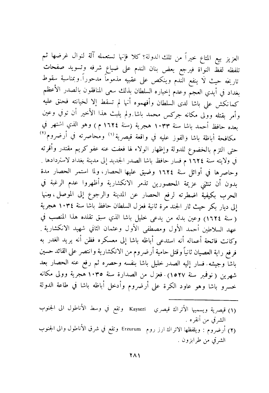 الْعَزِيز بيع الْمَتَاع خيرا من تِلْكَ الدولة كلا فانها تستعمله آلَة لنوال غرضها ثمَّ تلفظه لفظ النواة فَيرجع يعَض بنان النَّدَم على ضيَاع شرفه وتسويد صفحات تَارِيخه حَيْثُ لَا ينفع النَّدَم وينكص على عَقِبَيْهِ مذموما مَدْحُورًا وبمناسبة سُقُوط بَغْدَاد فِي ايدي الْعَجم وَعدم اخباره السُّلْطَان بذلك سعى المُنَافِقُونَ بالصدر الاعظم كمانكش على باشا لَدَى السُّلْطَان وافهموه انها لم تسْقط الا لخيانته فحنق عَلَيْهِ وامر بقتْله وَولى مَكَانَهُ جركس مُحَمَّد باشا وَلم يلبث هَذِه الاخير ان توفّي وَعين بعده حَافظ احْمَد باشا سنة 1033 هجرية سنة 1624 م وَهُوَ الَّذِي اشْتهر فِي مكافحة اباظة باشا سنة والفوز عَلَيْهِ فِي وَاقعَة قيصرية ومحاصرته فِي ارضروم حَتَّى الْتزم بالخضوع للدولة واظهار الْوَلَاء لَهَا فعفت عَنهُ عَفْو كريم مقتدر واقرته فِي ولَايَته سنة 1624 م فَسَار حَافظ باشا الصَّدْر الْجَدِيد إِلَى مَدِينَة بَغْدَاد لاستردادها وحاصرها فِي اوائل سنة 1624 وضيق عَلَيْهَا الْحصار وَلما اسْتمرّ الْحصار مُدَّة بِدُونِ ان تنثني عَزِيمَة المحصورين تذمر الانكشارية واظهروا عدم الرَّغْبَة فِي الْحَرْب بكيفية اضطرته لرفع الْحصار عَن الْمَدِينَة وَالرُّجُوع إِلَى الْموصل وَمِنْهَا إِلَى ديار بكر حَيْثُ ثار الْجند مرّة ثاينة فعزل السُّلْطَان حَافظ باشا سنة 1034 هجرية سنة 1624 م وَعين بدله من يدعى خَلِيل باشا الَّذِي سبق تقلده هَذَا المنصب فِي عهد السلاطين احْمَد الاول ومصطفى الاول وَعُثْمَان الثَّانِي شَهِيد الانكشارية وَكَانَت فَاتِحَة اعماله انه استدعى اباظه باشا إِلَى مُعَسْكَره فَظن انه يُرِيد الْغدر بِهِ فَرفع راية الْعِصْيَان ثَانِيًا وَقتل حامية ارضروم من الانكشارية وانتصر على الْقَائِد حُسَيْن باشا وجيشه فَسَار اليه الصَّدْر خَلِيل باشا بِنَفسِهِ وحصره ثمَّ رفع عَنهُ الْحصار بعد شَهْرَيْن نوفمبر سنة 1527 فعزل من الصدارة سنة 1035 هجرية وَولى مَكَانَهُ خسرو باشا وَهُوَ عاود الكرة على ارضروم وادخل اباظه باشا فِي طَاعَة الدولة