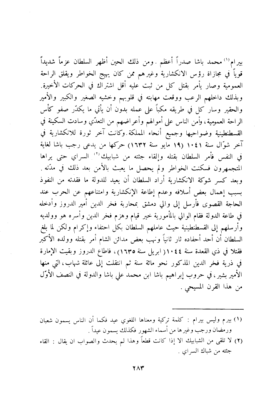 بيرام مُحَمَّد باشا صَدرا اعظم وَمن ذَلِك الْحِين اظهر السُّلْطَان عزما شَدِيدا قَوِيا فِي مجازاة رُؤْس الانكشارية وَغَيرهم مِمَّن كَانَ يهيج الخواطر ويقلق الرَّاحَة العمومية وَصَارَ يامر بقتل كل من ثَبت عَلَيْهِ اقل اشْتِرَاك فِي الحركات الاخيرة وَبِذَلِك داخلهم الرعب وَوَقعت مهابته فِي قُلُوبهم وخشيه الصَّغِير وَالْكَبِير والامير والحقير وَسَار كل فِي طَرِيقه مكبا على عمله بِدُونِ أَن ياتي مَا يكدر صفو كأس الرَّاحَة العمومية وَأمن النَّاس على اموالهم واعراضهم من التَّعَدِّي وسادت السكينَة فِي الْقُسْطَنْطِينِيَّة وضواحيها وَجَمِيع انحاء المملكة وَكَانَت آخر ثورة للانكشارية فِي آخر شَوَّال سنة 1041 19 مايو سنة 1632 حركها من يدعى رَجَب باشا لغاية فِي النَّفس فامر السُّلْطَان بقتْله والقاء جثته من شبابيك السراي حَتَّى يَرَاهَا المتجمهرون فسكنت الخواطر وَلم يحصل مَا يعبث بالامن بعد ذَلِك فِي مدَّته وَبعد كسر شَوْكَة الانكشارية اراد السُّلْطَان ان يُعِيد للدولة مَا فقدته من النّفُوذ بِسَبَب اهمال بعض اسلافه وَعدم اطاعة الانكشارية وامتناعهم عَن الْحَرْب عِنْد الْحَاجة القصوى فارسل إِلَى وَالِي دمشق بمحاربة فَخر الدّين امير الدوروز وادخله فِي طَاعَة الدولة فَقَامَ الْوَالِي بالمامورية خير قيام وَهزمَ فَخر الدّين واسره هُوَ وولديه وارسلهم إِلَى الْقُسْطَنْطِينِيَّة حَيْثُ عاملهم السُّلْطَان بِكُل احتفاء واكرام وَلَكِن لما بلغ السُّلْطَان ان اُحْدُ احفاده ثار ثَانِيًا وَنهب بعض مَدَائِن الشَّام امْر بقتْله وَولده الاكبر فقتلا فِي ذِي الْقعدَة سنة 1044 ابريل سنة 1635 فاطاع الدروز وَبقيت الامارة فِي ذُرِّيَّة فَخر الدّين الْمَذْكُور نَحْو مائَة سنة ثمَّ انْتَقَلت إِلَى عائلة شهَاب الَّتِي مِنْهَا الامير بشير فِي حروب ابراهيم باشا ابْن مُحَمَّد عَليّ باشا والدولة فِي النّصْف الاول من هَذَا الْقرن المسيحي