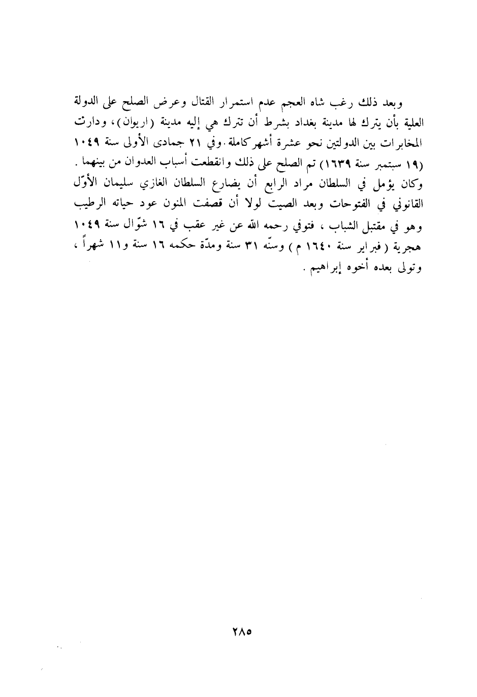 وَبعد ذَلِك رغب شاه الْعَجم عدم اسْتِمْرَار الْقِتَال وَعرض الصُّلْح على الدولة الْعلية بَان يتْرك لَهَا مَدِينَة بَغْدَاد بِشَرْط ان تتْرك هِيَ اليه مَدِينَة اريوان ودارت المخابرات بَين الدولتين نَحْو عشرَة اشهر كَامِلَة وَفِي 21 جُمَادَى الاولى سنة 1049 19 سبتمبر سنة 1639 تمّ الصُّلْح على ذَلِك وانقطعت اسباب الْعدوان من بَينهمَا وَكَانَ يؤمل فِي السُّلْطَان مُرَاد الرَّابِع أَن يضارع السُّلْطَان الْغَازِي سُلَيْمَان الاول القانوني فِي الفتوحات وَبعد الصيت لَوْلَا ان قصفت الْمنون عود حَيَاته الرطيب وَهُوَ فِي مقتبل الشَّبَاب فتوفى يرحمه الله عَن غير عقب فِي 16 شَوَّال سنة 1049 هجرية فبراير سنة 1640 م وسنه 31 سنة وَمُدَّة حكمه 16 سنة و 11 شهرا وَتَوَلَّى بعده اخوه ابراهيم