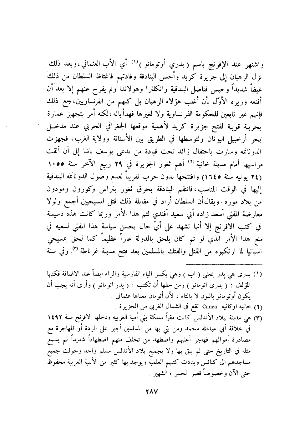 واشتهر عِنْد الافرنج باسم بَدْرِي اوتوماتو أَي الاب العثماني وَبعد ذَلِك نزل الرهبان إِلَى جَزِيرَة كريد واحسن البنادقة وفادتهم فاغتاظ السُّلْطَان من ذَلِك غيظا شَدِيدا وَحبس قناصل البندقية وانكلترا وهولاندا وَلم يفرج عَنْهُم الا بعد ان اقنعه وزيره الاول بَان اغلب هَؤُلَاءِ الرهبان بل كلهم من الفرنساويين وَمَعَ ذَلِك فانهم غير تابعين للحكومة الفرنساوية وَلَا لغَيْرهَا فهدأ باله وَلكنه امْر بتجهيز عمَارَة بحريّة قَوِيَّة لفتح جَزِيرَة كريد لاهمية موقعها الجغرافي الْحَرْبِيّ عِنْد مدْخل بَحر ارخبيل اليونان ولتوسطها فِي الطَّرِيق بَين الاستانة وَولَايَة الغرب فجهزت الدونانمة وسارت باحتفال زَائِد تَحت قيادة من يدعى يُوسُف باشا إِلَى ان القت مراسيها امام مَدِينَة خَانِية اهم ثغور الجزيرة فِي 29 ربيع الآخر سنة 1055 24 يونيه سنة 1645 وافتتحها بِدُونِ حَرْب تَقْرِيبًا لعدم وُصُول الدونانمه البندقية اليها فِي الْوَقْت الْمُنَاسب فانتقم البنادقة بحرق ثغور بتراس وكورون ومودون من بِلَاد موره وَيُقَال ان السُّلْطَان اراد فِي مُقَابلَة ذَلِك قتل المسيحيين اجْمَعْ وَلَوْلَا مُعَارضَة الْمُفْتِي اِسْعَدْ زَاده ابي سعيد افندي لتم هَذَا الامر وَرُبمَا كَانَت هَذِه دسيسة فِي كتب الافرنج الا انها تشهد على أَي حَال بِحسن سياسة هَذَا الْمُفْتِي لسعيه فِي منع هَذَا الامر الَّذِي لَو تمّ كَانَ يلْحق بالدولة عارا عَظِيما كَمَا لحق بمسيحي اسبانيا لما ارتكبوه من الْقَتْل والفتك بِالْمُسْلِمين بعد فتح مَدِينَة غرناطة وَفِي سنة 1646