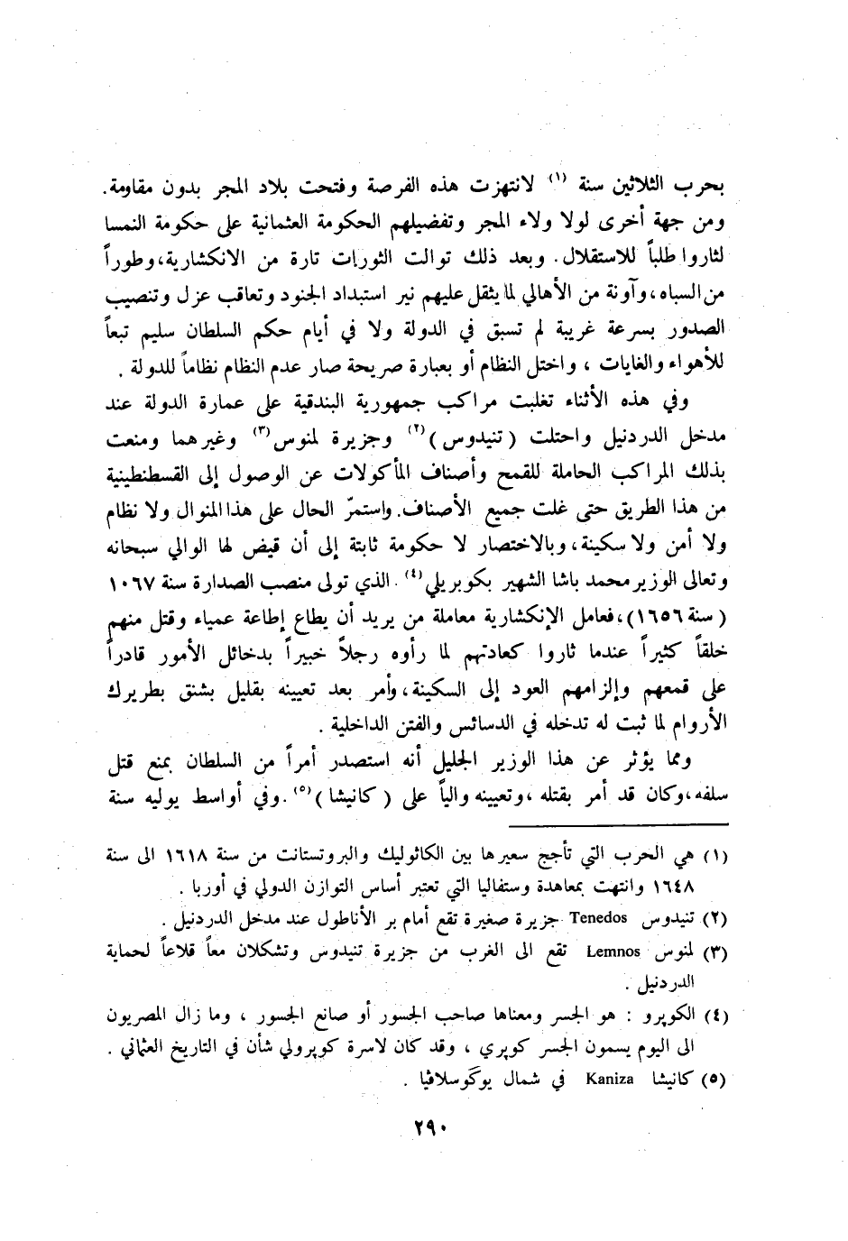 بِحَرب الثَّلَاثِينَ سنة لانتهزنت هَذِه الفرصة وَفتحت بِلَاد المجر بِدُونِ مقاومة وَمن جِهَة اخرى لَوْلَا وَلَاء المجر وتفضيلهم الْحُكُومَة العثمانية على حُكُومَة النمسا لثاروا طلبا للاستقلال وَبعد ذَلِك توالت الثورات تَارَة من الانكشارية وطورا من السباه وآونة من الاهالي لما يثقل عَلَيْهِم نير استبداد الْجنُود وتعاقب عزل وتنصيب الصُّدُور بِسُرْعَة غَرِيبَة لم تسبق فِي الدولة وَلَا فِي ايام حكم السُّلْطَان سليم تبعا للاهواء والغايات واختل النظام اَوْ بِعِبَارَة صَرِيحَة صَار عدم النظام نظاما للدولة