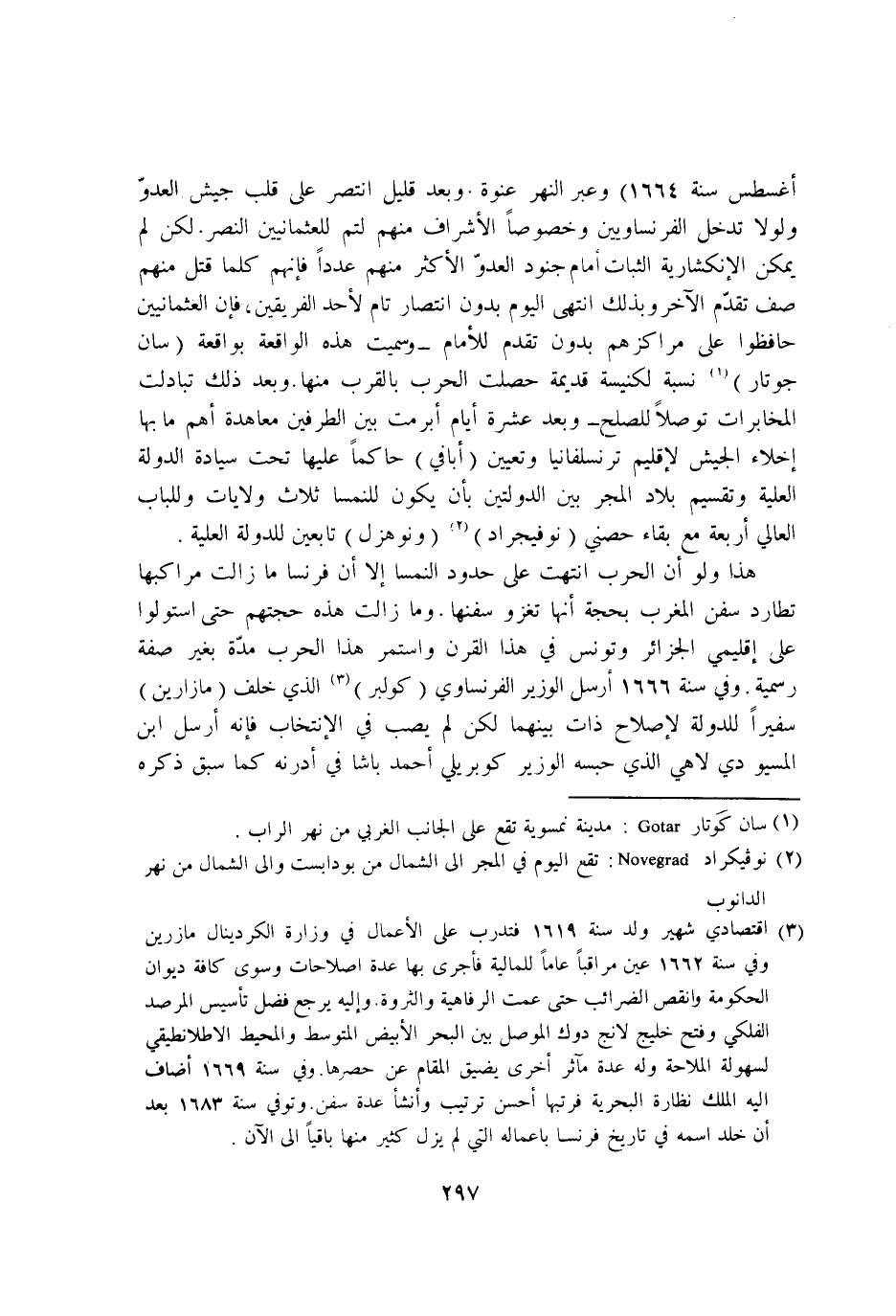 هَذَا وَلَو ان الْحَرْب انْتَهَت على حُدُود النمسا الا ان فرنسا مَا زَالَت مراكبها تطارد سفن الْمغرب بِحجَّة انها تغزو سفنها وَمَا زَالَت هَذِه حجتهم حَتَّى استولوا على اقليمي الجزائر وتونس فِي هَذَا الْقرن وَاسْتمرّ هَذَا الْحَرْب مُدَّة بِغَيْر صفة رسمية وَفِي سنة 1666 ارسل الْوَزير الفرنساوي كولبر الَّذِي خلف مازارين سفيرا للدولة لاصلاح ذَات بَينهمَا لَكِن لم يصب فِي الانتخاب فانه ارسل ابْن المسيو دي لاهي الَّذِي حَبسه الْوَزير كوبريلي احْمَد باشا فِي ادرنه كَمَا سبق ذكره