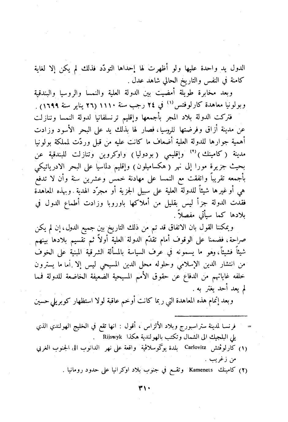 وَبعد مخابرة طَوِيلَة امضيت بَين الدولة الْعلية والنمسا والروسيا والبندقية وبولونيا معاهدة كارلوفتس فِي 24 رَجَب سنة 1110 26 يناير سنة 1699