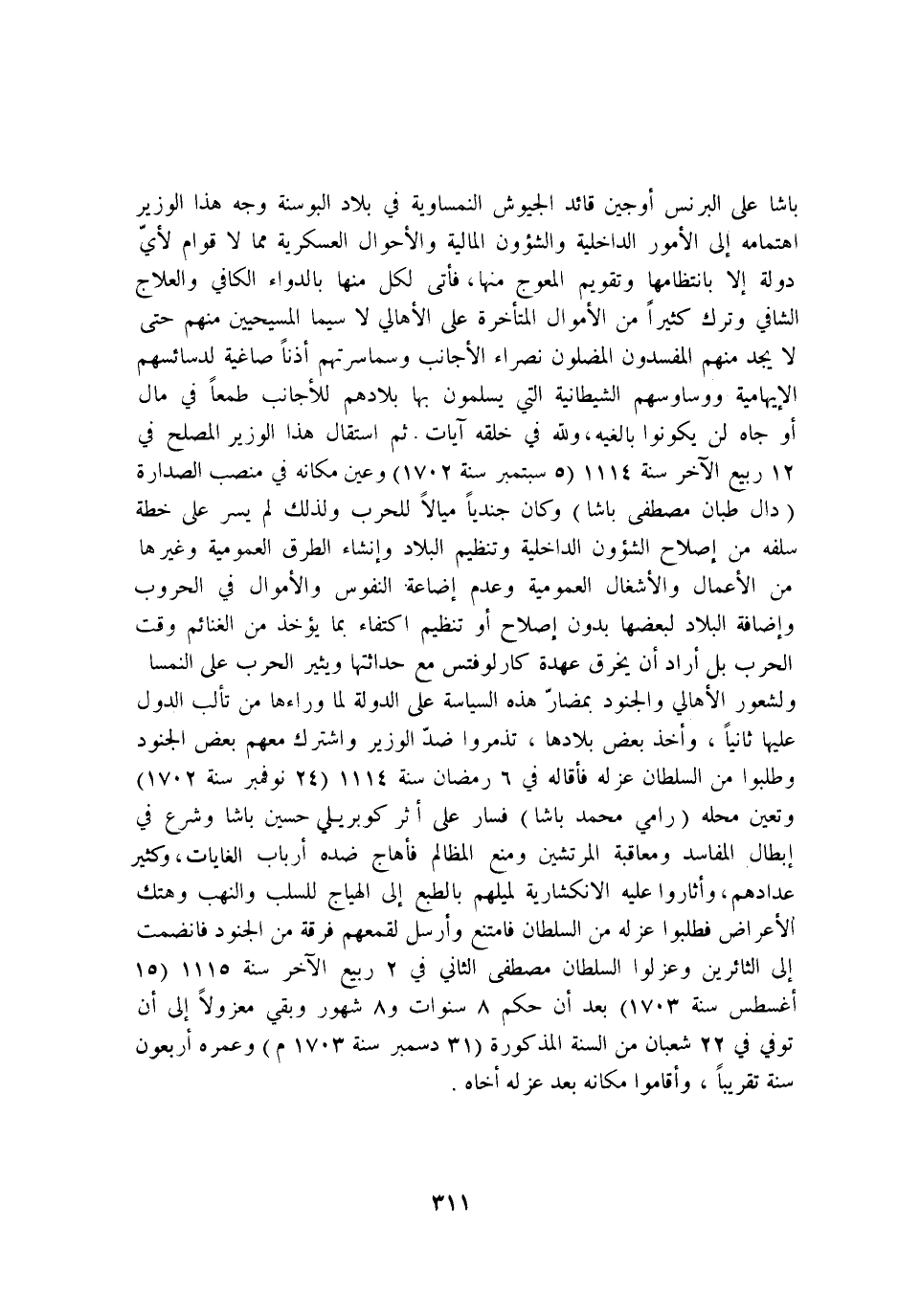 باشا على الْبُرْنُس اوجين قَائِد الجيوش النمساوية فِي بِلَاد البوسنة وَجه هَذَا الْوَزير اهتمامه إِلَى الامور الداخلية والشؤون الْمَالِيَّة والاحوال العسكرية مِمَّا لَا قوام لاي دولة الا بانتظامها وتقويم المعوج مِنْهَا فاتى لكل مِنْهَا بالدواء الْكَافِي والعلاج الشافي وَترك كثيرا من الاموال الْمُتَأَخِّرَة على الاهالي لَا سِيمَا المسيحيين مِنْهُم حَتَّى لَا يجد مِنْهُم المفسدون المضلون نصراء الاجانب وسماسرتهم اذنا صاغية لدسائسهم الايهامية ووساوسهم الشيطانية الَّتِي يسلمُونَ بهَا بِلَادهمْ للاجانب طَمَعا فِي مَال اَوْ جاه لن يَكُونُوا بالغيه وَللَّه فِي خلقه آيَات ثمَّ استقال هَذَا الْوَزير المصلح فِي 12 ربيع الآخر سنة 1114 5 سبتمبر سنة 1702 وَعين مَكَانَهُ فِي منصب الصدارة دَال طبان مصطفى باشا وَكَانَ جنديا ميالا للحرب وَلذَلِك لم يسر على خطة سلفه من اصلاح الشؤون الداخلية وتنظيم الْبِلَاد وانشاء الطّرق العمومية وَغَيرهَا من الاعمال والاشغال العمومية وَعدم اضاعة النُّفُوس والاموال فِي الحروب واضافة الْبِلَاد لبعضها بِدُونِ اصلاح اَوْ تنظيم اكْتِفَاء بِمَا يُؤْخَذ من الْغَنَائِم وَقت الْحَرْب بل اراد ان يخرق عُهْدَة كارلوفتس مَعَ حداثتها ويثير الْحَرْب على النمسا ولشعور الاهالي والجنود بمضار هَذِه السياسة على الدولة لما وَرَاءَهَا من تَأَلُّبُ الدول عَلَيْهَا ثَانِيًا واخذ بعض بلادها تذمروا ضد الْوَزير واشترك مَعَهم بعض الْجنُود وطلبوا من السُّلْطَان عَزله فاقاله فِي 6 رَمَضَان سنة 1114 24 نوفمبر سنة 1702 وَتعين مَحَله رامي مُحَمَّد باشا فَسَار على اثر كوبريلي حُسَيْن باشا وَشرع فِي ابطال الْمَفَاسِد ومعاقبة المرتشين وَمنع الْمَظَالِم فاهاج ضِدّه ارباب الغايات وَكثير عدادهم واثاروا عَلَيْهِ الانكشارية لميلهم بالطبع إِلَى الْهياج للسلب والنهب وهتك الاعراض فطلبوا عَزله من السُّلْطَان فَامْتنعَ وارسل لقمعهم فرقة من الْجنُود فانضمت إِلَى الثائرين وعزلوا السُّلْطَان مصطفى الثَّانِي فِي 2 ربيع الآخر سنة 1115 15 اغسطس سنة 1703 بعد ان حكم 8 سنوات و 8 شهور وَبَقِي معزولا إِلَى ان توفّي فِي 22 شعْبَان من السّنة الْمَذْكُورَة 31 دسمبر سنة 1703 م وعمره اربعون سنة تَقْرِيبًا واقاموا مَكَانَهُ بعد عَزله اخاه