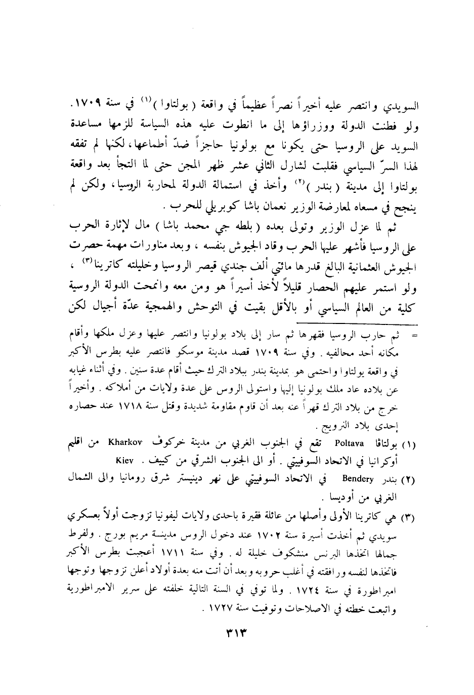 السويدي وانتصر عَلَيْهِ اخيرا نصرا عَظِيما فِي وَاقعَة بولتاوا فِي سنة 1709 وَلَو فطنت الدولة ووزراؤها إِلَى مَا انطوت عَلَيْهِ هَذِه السياسة للزمها مساعدة السويد على الروسيا حَتَّى يَكُونَا مَعَ بولونيا حاجزا ضد اطماعها لَكِنَّهَا لم تفقه لهَذَا السِّرّ السياسي فقلبت لشارل الثَّانِي عشر ظهر الْمِجَن حَتَّى لما التجأ بعد وَاقعَة بولتاوا إِلَى مَدِينَة بندر واخذ فِي استمالة الدولة لمحاربة الروسيا وَلَكِن لم ينجح فِي مسعاه لمعارضة الْوَزير نعْمَان باشا كوبريلي للحرب