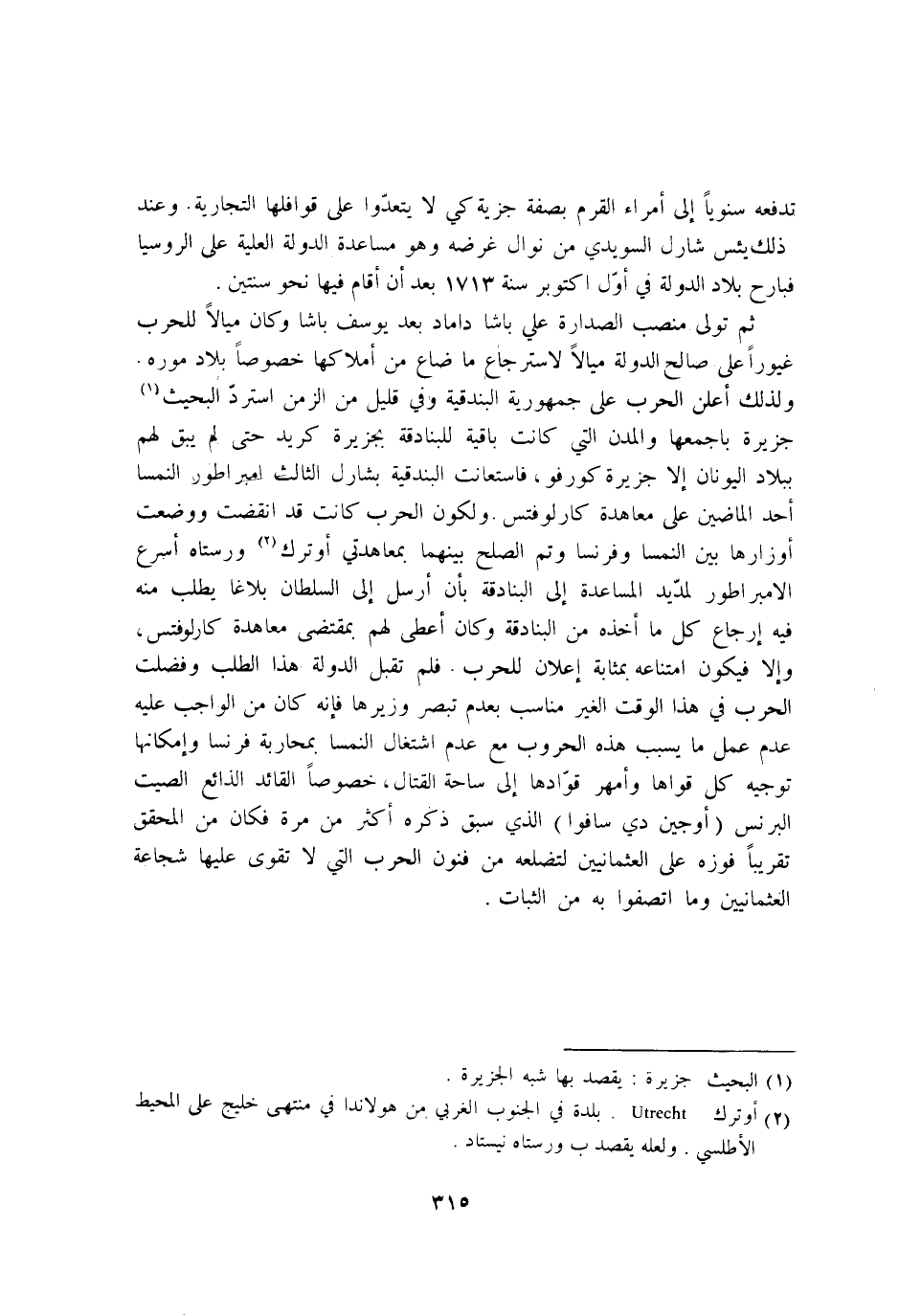 ثمَّ تولى منصب الصدارة عَليّ باشا داماد بعد يُوسُف باشا وَكَانَ ميالا للحرب غيورا على صَالح الدولة ميالا لاسترجاع ماضاع من املاكها خُصُوصا بِلَاد موره وَلذَلِك اعلن الْحَرْب على جمهورية البندقية وَفِي قَلِيل من الزَّمن اسْتردَّ البحيث جَزِيرَة باجمعها والمدن الَّتِي كَانَت بَاقِيَة للبنادقة بِجَزِيرَة كريد حَتَّى لم يبْق لَهُم بِبِلَاد اليونان الا جَزِيرَة كورفو فاستعانت البندقية بشارل الثَّالِث امبراطور النمسا اُحْدُ الماضين على معاهدة كارلوفتس وَلكَون الْحَرْب كَانَت قد انْقَضتْ وَوضعت اوزارها بَين النمسا وفرنسا وَتمّ الصُّلْح بَينهمَا بمعاهدتي اوترك ورستاه اسرع الامبراطور لمديد المساعدة إِلَى البنادقة بَان ارسل إِلَى السُّلْطَان بلاغا يطْلب مِنْهُ فِيهِ ارجاع كل مَا اخذه من البنادقة وَكَانَ اعطى لَهُم بِمُقْتَضى معاهدة كارلوفتس والا فَيكون امْتِنَاعه بِمَثَابَة اعلان للحرب فَلم تقبل الدولة هَذَا الطّلب وفضلت الْحَرْب فِي هَذَا الْوَقْت الْغَيْر مُنَاسِب بِعَدَمِ تبصر وزيرها فانه كَانَ من الْوَاجِب عَلَيْهِ عدم عمل مَا يسبب هَذِه الحروب مَعَ عدم اشْتِغَال النمسا بمحاربة فرنسا وامكانها تَوْجِيه كل قواها وامهر قوادها إِلَى ساحة الْقِتَال خُصُوصا الْقَائِد الذائع الصيت الْبُرْنُس اوجين دي سافوا الَّذِي سبق ذكره اكثر من مرّة فَكَانَ من الْمُحَقق تَقْرِيبًا فوزه على العثمانيين لتضلعه من فنون الْحَرْب الَّتِي لَا تقوى عَلَيْهَا شجاعة العثمانيين وَمَا اتصفوا بِهِ من الثَّبَات