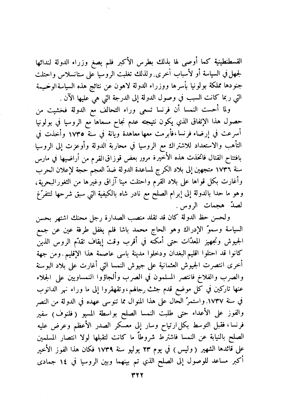 ولحسن حَظّ الدولة كَانَ قد تقلد منصب الصدارة رجل محنك اشْتهر بِحسن السياسة وسمو الادراك وَهُوَ الْحَاج مُحَمَّد باشا فَلم يغْفل طرفَة عين عَن جمع الجيوش وتجهيز المعدات حَتَّى امكنه فِي اقْربْ وَقت ايقاف تقدم الروس الَّذين كَانُوا قد احتلوا إقليم البغدان ودخلوا مَدِينَة باسى عَاصِمَة هَذَا الاقليم وَمن جِهَة اخرى انتصرت الجيوش العثمانية على جيوش النمسا الي اغارت على بِلَاد البوسنة والصرب والفلاخ فانتصر الْمُسلمُونَ فِي الصرب والجاؤوا النمساويين على الْجلاء عَنْهَا تاركين فِي كل مَوضِع قدم حثث رِجَالهمْ وتقهقروا إِلَى مَا وَرَاء نهر الدانوب فِي سنة 1737 وَاسْتمرّ الْحَال على هَذَا المنوال مِمَّا تنوسى عَهده فِي الدولة من النَّصْر والفوز على الاعداء حَتَّى طلبت النمسا الصُّلْح بِوَاسِطَة المسيو فلنوف سفير فرنسا فَقبل التَّوَسُّط بِكُل ارتياح وَسَار إِلَى معسكر الصَّدْر الاعظم وَعرض عَلَيْهِ الصُّلْح بالنيابة عَن النمسا فَاشْترط شُرُوطًا مَا كَانَت لتقبلها لَوْلَا انتصار الْمُسلمين على قائدها الشهير وَلَيْسَ فِي يَوْم 23 يوليو سنة 1739 فَكَانَ هَذَا الْفَوْز الاخير اكبر مساعد للوصول إِلَى الصُّلْح الَّذِي تمّ بَينهمَا وَبَين الروسيا فِي 14 جُمَادَى الْآخِرَة