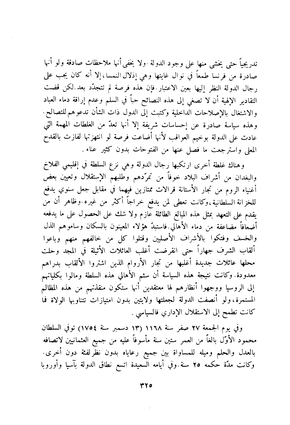 وَفِي يَوْم الْجُمُعَة 27 صفر سنة 1168 13 دسمبر سنة 1754 توفّي السُّلْطَان مَحْمُود الاول بَالغا من الْعُمر سِتِّينَ سنة ماسوفا عَلَيْهِ من جَمِيع العثمانيين لاتصافه بِالْعَدْلِ والحلم وميله للمساواة بَين جَمِيع رعاياه بِدُونِ نظر لفئة دون اخرى وَكَانَت مُدَّة حكمه 25 سنة وَفِي ايامه السعيدة اتَّسع نطاق الدولة بآسيلا واوروبا