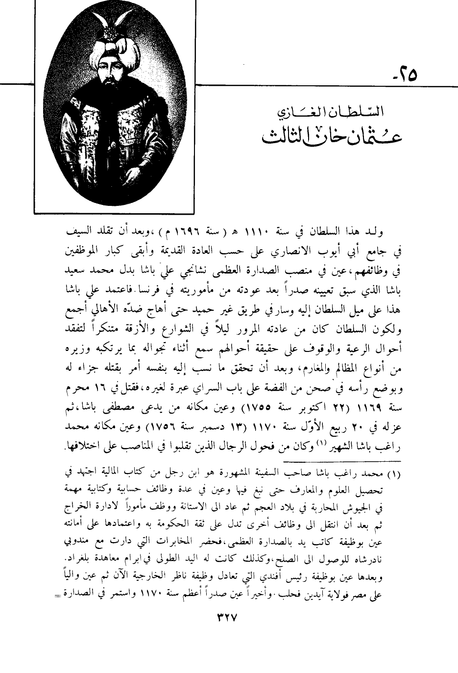 ولد هَذَا السُّلْطَان فِي سنة 1110 هـ سنة 1696 م وَبعد ان تقلد السَّيْف فِي جَامع ابي ايوب الانصاري على حسب الْعَادة الْقَدِيمَة وابقى كبار الموظفين فِي وظائفهم عين فِي منصب الصدارة الْعُظْمَى نشانجي عَليّ باشا بدل مُحَمَّد سعيد باشا الَّذِي سبق تَعْيِينه صَدرا بعد عودته من ماموريته فِي فرنسا فاعتمد عَليّ باشا هَذَا على ميل السُّلْطَان اليه وَسَار فِي طَرِيق غير حميد حَتَّى اهاج ضِدّه الاهالي اجْمَعْ وَلكَون السُّلْطَان كَانَ من عَادَته الْمُرُور لَيْلًا فِي الشوارع والازقة متنكرا لتفقد احوال الرّعية وَالْوُقُوف على حَقِيقَة احوالهم سمع اثناء تجواله بِمَا يرتكبه وزيره من انواع الْمَظَالِم والمغارم وَبعد ان تحقق مَا نسب اليه بِنَفسِهِ امْر بقتْله جَزَاء لَهُ وبوضع راسه فِي صحن من الْفضة على بَاب السراي عِبْرَة لغيره فَقتل فِي 16 محرم سنة 1169 هـ 22 اكتوبر سنة 1755 م وَعين مَكَانَهُ من يدعى مصطفى باشا ثمَّ عَزله فِي 20 ربيع الاول سنة 1170 هـ 13 ديسمبر سنة 1756 م وَعين مَكَانَهُ مُحَمَّد رَاغِب باشا الشهير وَكَانَ من فحول الرِّجَال الَّذين تقلبوا فِي المناصب على اختلافها