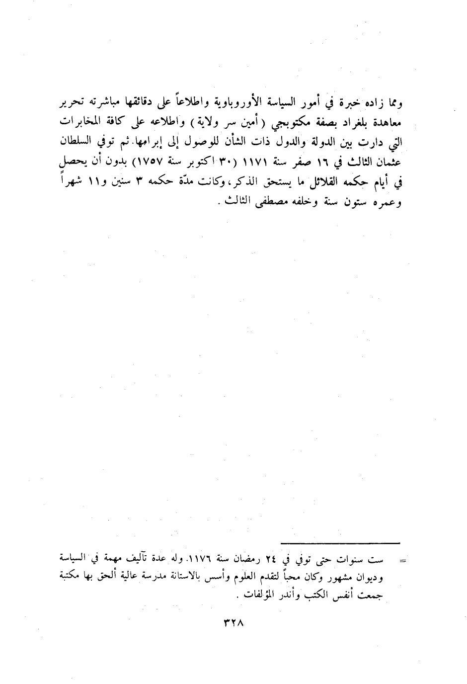 وَمِمَّا زَاده خبْرَة فِي امور السياسة الاوروباوية واطلاعا على دقائقها مُبَاشَرَته تَحْرِير معاهدة بلغراد بِصفة مكتوبجي امين سر ولَايَة واطلاعه على كَافَّة المخابرات الَّتِي دارت بَين الدولة والدول ذَات الشان للوصول إِلَى ابرامها ثمَّ توفّي السُّلْطَان عُثْمَان الثاث فِي 16 صفر سنة 1171 هـ 30 اكتوبر سنة 1757 بِدُونِ ان يحصل فِي ايام حكمه القلائل مَا يسْتَحق الذّكر وَكَانَت مُدَّة حكمه 3 سِنِين و 11 شهر وعمره سِتُّونَ سنة وَخَلفه مصطفى الثَّالِث