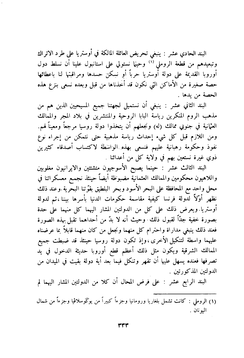 البند الْحَادِي عشر يَنْبَغِي تحريض العائلة المالكة فِي اوستريا على طرد الاتراك وتبعيدهم من قِطْعَة الروملي وحينما نستولي على استانبول علينا ان نسلط دوَل اوروبا الْقَدِيمَة على دولة اوستريا حَربًا اَوْ نسكن حسدها ومراقبتها لنا باعطائها حِصَّة صَغِيرَة من الاماكن الَّتِي نَكُون قد اخذناها من قبل وَبعده نسعى بِنَزْع هَذِه الْحصَّة من يَدهَا