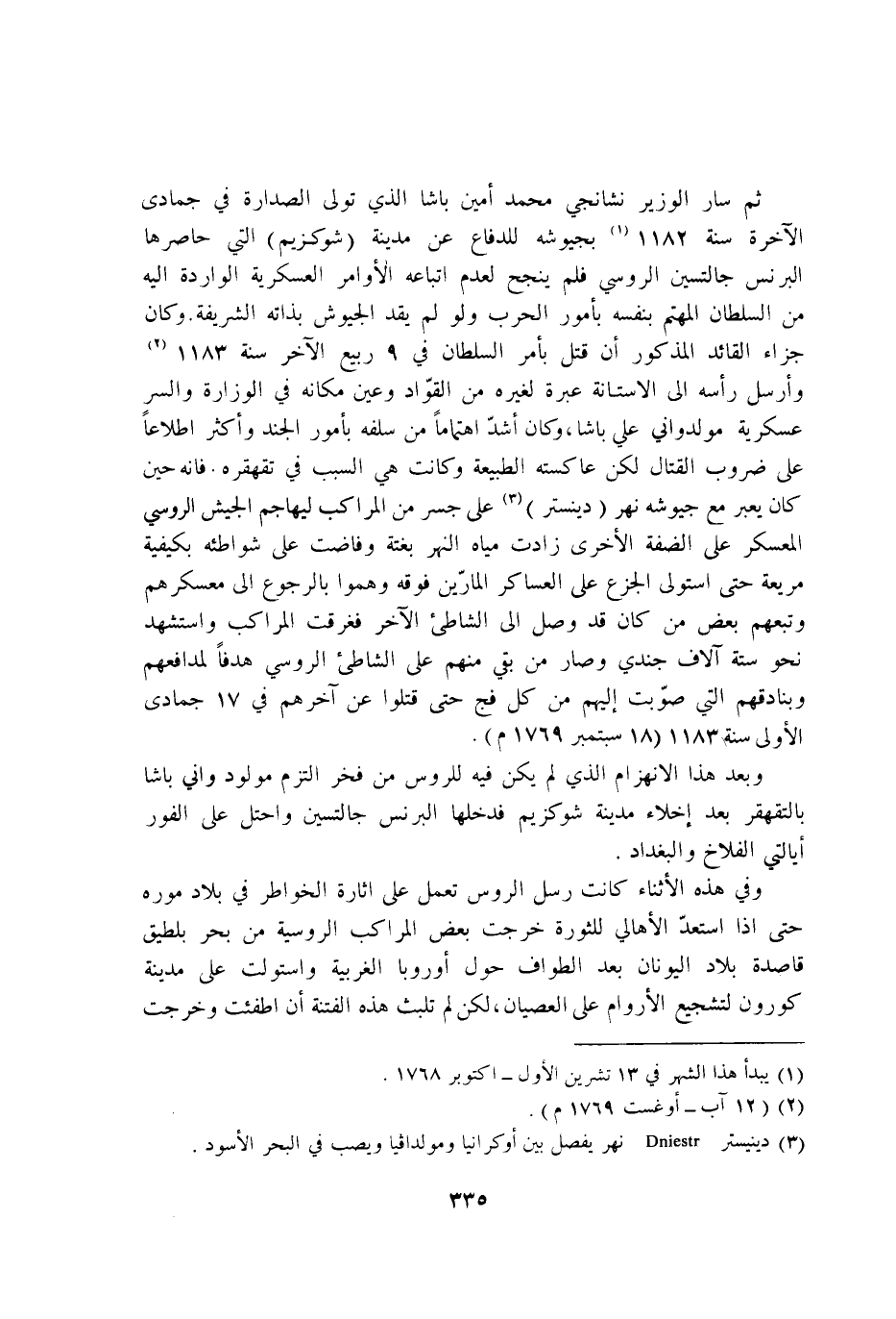 ثمَّ سَار الْوَزير نشانجي مُحَمَّد امين باشا الَّذِي تولى الصدارة فِي جُمَادَى الْآخِرَة سنة 1182 بجيوشه للدفاع عَن مَدِينَة شوكزيم الَّتِي حاصرها الْبُرْنُس جالتسين الروسي فَلم ينجح لعدم اتِّبَاعه الاوامر العسكرية الْوَارِدَة اليه من السُّلْطَان المهتم بِنَفسِهِ بامور الْحَرْب وَلَو لم يقد الجيوش بِذَاتِهِ الشَّرِيفَة وَكَانَ جَزَاء الْقَائِد الْمَذْكُور ان قتل بامر السُّلْطَان فِي 9 ربيع الآخر سنة 1183 وارسل راسه إِلَى الاستانة عِبْرَة لغيره من القواد وَعين مَكَانَهُ فِي الوزارة والسر عسكرية مولدواني على باشا وَكَانَ اشد اهتماما من سلفه بامور الْجند واكثر اطلاعا على ضروب الْقِتَال لَكِن عاكسته الطبيعة وَكَانَت هِيَ السَّبَب فِي تقهقره فانه حِين كَانَ يعبر مَعَ جيوشه نهر دينستر على جسر من المراكب ليهاجم الْجَيْش الروسي المعسكر على الضفة الاخرى زَادَت مياه النَّهر بَغْتَة وفاضت على شواطئه بكيفية مريعة حَتَّى استولى الْجزع على العساكر المارين فَوْقه وهموا بِالرُّجُوعِ إِلَى معسكرهم وتبعهم بعض من كَانَ قد وصل إِلَى الشاطئ الآخر فغرقت المراكب وَاسْتشْهدَ نَحْو سِتَّة الآف جندي وَصَارَ من بَقِي مِنْهُم على الشاطئ الروسي هدفا لمدافعهم وبنادقهم الَّتِي صوبت اليهم من كل فج حَتَّى قتلوا عَن آخِرهم فِي 17 جُمَادَى الاولى سنة 1183 18 سبتمبر سنة 1769 م