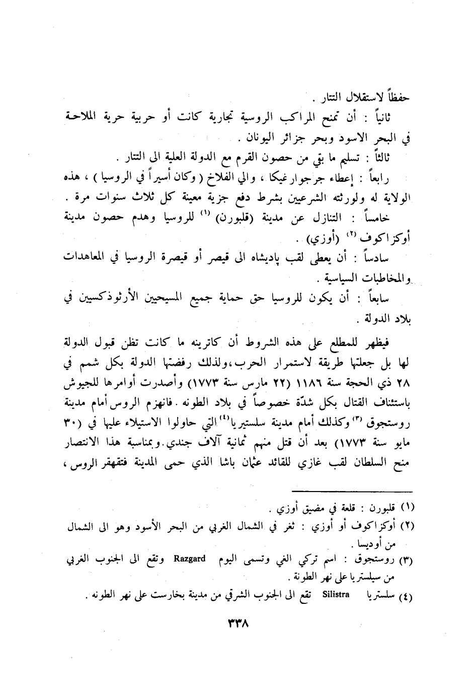 فَيظْهر للمطلع على هَذِه الشُّرُوط ان كاترينه مَا كَانَت تظن قبُول الدولة لَهَا بل جَعلتهَا طَريقَة لاستمرار الْحَرْب وَلذَلِك رفضتها الدولة بِكُل شمم فِي 28 ذِي الْحجَّة سنة 1186 22 مارس سنة 1773 واصدرت اوامرها للجيوش باستئناف الْقِتَال بِكُل شدَّة خُصُوصا فِي بِلَاد الطونه فَانْهَزَمَ الروس امام مَدِينَة روستجوق وَكَذَلِكَ امام مَدِينَة سلستيريا الَّتِي حاولوا الِاسْتِيلَاء عَلَيْهَا فِي 30 مايو سنة 1773 بعد ان قتل مِنْهُم ثَمَانِيَة آلَاف جندي وبمناسبة هَذَا الِانْتِصَار منح السُّلْطَان لقب غَازِي للقائد عُثْمَان باشا الَّذِي حمى الْمَدِينَة فتقهقر الروس