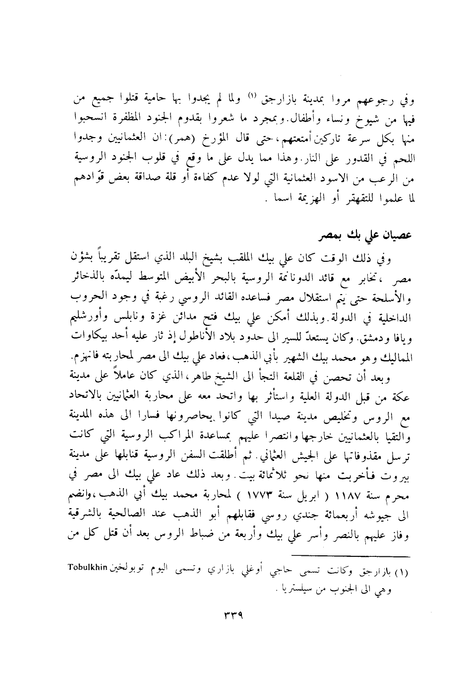 وَبعد ان تحصن فِي القلعة التجأ إِلَى الشَّيْخ طَاهِر الَّذِي كَانَ عَاملا على مَدِينَة عكة من قبل الدولة الْعلية واستأثر بهَا واتحد مَعَه على محاربة العثمانيين بالاتحاد مَعَ الروس وتخليص مَدِينَة صيدا الَّتِي كَانُوا يحاصرونها فسارا إِلَى هَذِه الْمَدِينَة والتقيا بالعثمانيين خَارِجهَا وانتصرا عَلَيْهِم بمساعدة المراكب الروسية الَّتِي كَانَت ترسل مقذوفاتها على الْجَيْش العثماني ثمَّ اطلقت السفن الروسية قنابلها على مَدِينَة بيروت فاخربت مِنْهَا نَحْو ثَلَاثمِائَة بَيت وَبعد ذَلِك عَاد عَليّ بيك إِلَى مصر فِي محرم سنة 1187 ابريل سنة 1773 لمحاربة مُحَمَّد بيك ابي الذَّهَب وانضم إِلَى جيوشه اربعمائة جندي روسي فقابلهم ابو الذَّهَب عِنْد الصالحية بالشرقية وفاز عَلَيْهِم بالنصر واسر عَليّ بيك واربعة من ضباط الروس بعد ان قتل كل من