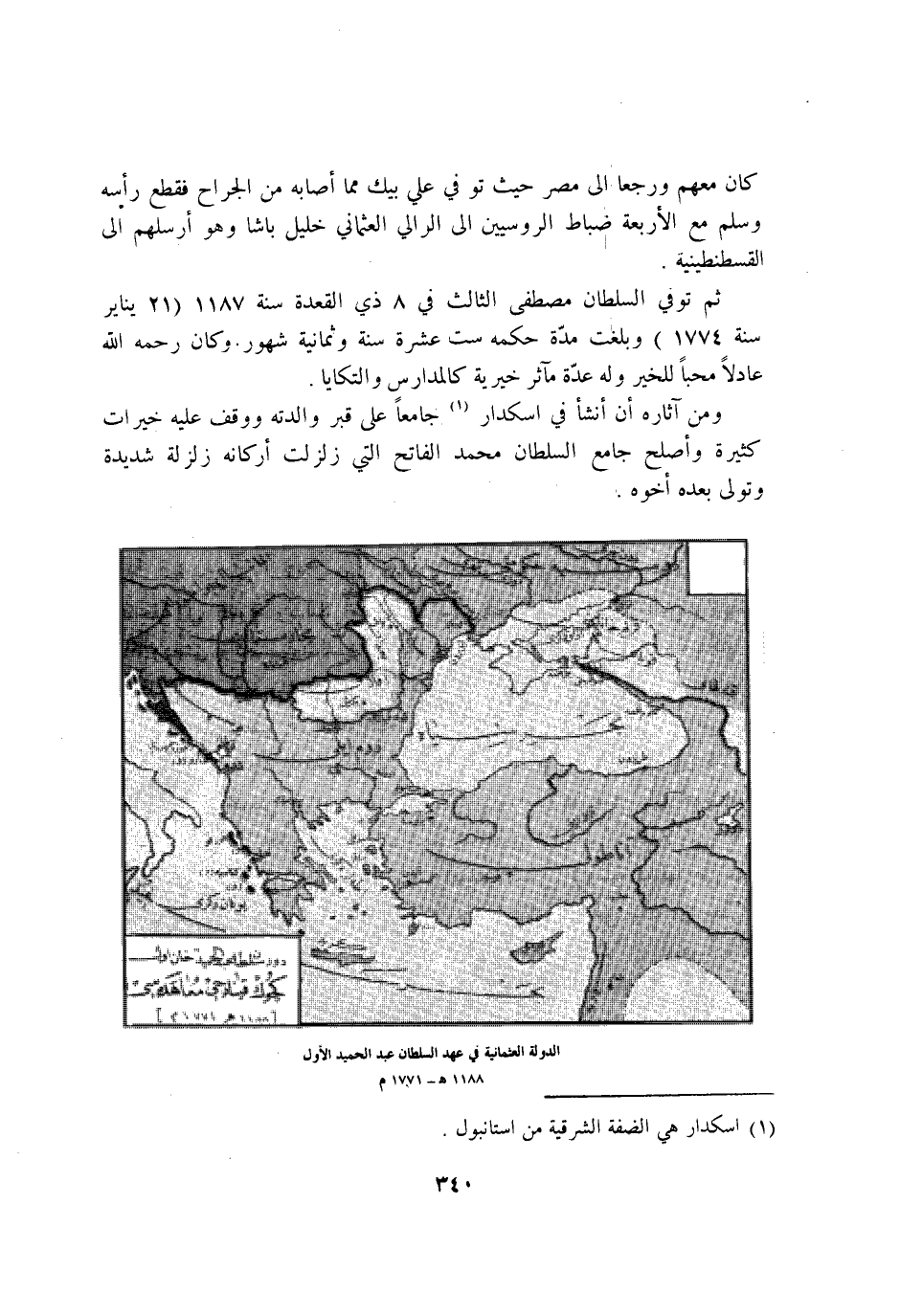 ثمَّ توفّي السُّلْطَان مصطفى الثَّالِث فِي 8 ذِي الْقعدَة سنة 1187 21 يناير سنة 1774 وَبَلغت مُدَّة حكمه سِتّ عشرَة سنة وَثَمَانِية شهور وَكَانَ رَحمَه الله عادلا محبا للخير وَله عدَّة مآثر خيرية كالمدارس والتكايا