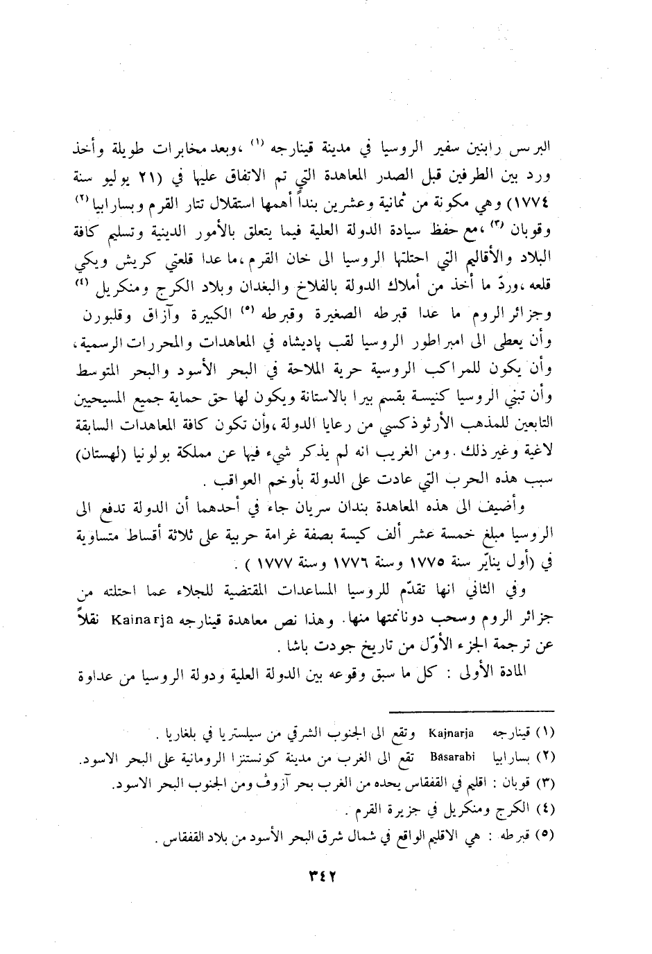 وَفِي الثَّانِي انها تقدم للروسيا المساعدات الْمُقْتَضِيَة للجلاء عَمَّا احتلته من جزائر الرّوم وسحب دونانمتها مِنْهَا وَهَذَا نَص معاهدة قينارجه نقلا عَن تَرْجَمَة الْجُزْء الاول من تَارِيخ جودت باشا