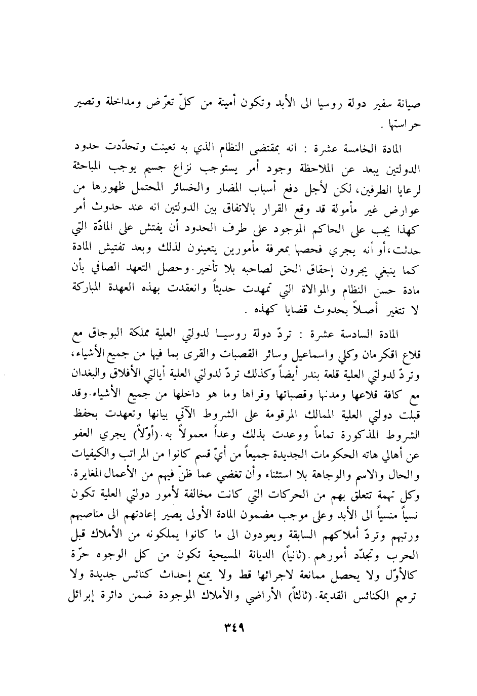 الْمَادَّة السَّادِسَة عشرَة ترد دولة روسيا لدولتي الْعلية مملكة البوجاق مَعَ قلاع اقكرمان وكلي واسماعيل وَسَائِر القصبات والقرى بِمَا فِيهَا من جَمِيع الاشياء وَترد لدولتي الْعلية قلعة بندر ايضا وَكَذَلِكَ ترد لدولتي الْعلية ايالتي الافلاق والبغدان مَعَ كَافَّة قلاعها ومدنها وقصباتها وقراها وَمَا هُوَ داخلها من جَمِيع الاشياء وَقد قبلت دَوْلَتِي الْعلية الممالك المرقومة على الشُّرُوط الْآتِي بَيَانهَا وتعهدت بِحِفْظ الشُّرُوط الْمَذْكُورَة تَمامًا ووعدت بذلك وَعدا مَعْمُولا بِهِ اولا يجْرِي الْعَفو عَن اهالي هاته الحكومات الجديدة جَمِيعًا من أَي قسم كَانُوا من الْمَرَاتِب والكيفيات وَالْحَال وَالِاسْم والوجاهة بِلَا اسْتثِْنَاء وان تغضي عَمَّا ظن فيهم من الاعمال الْمُغَايرَة وكل تُهْمَة تتَعَلَّق بهم من الحركات الَّتِي كَانَت مُخَالفَة لامور دَوْلَتِي الْعلية تكون نسيا منسيا إِلَى الابد وعَلى مُوجب مَضْمُون الْمَادَّة الاولى يصير اعادتهم إِلَى مناصبهم ورتبهم وَترد املاكهم السَّابِقَة ويعودون إِلَى مَا كَانُوا يملكونه من الاملاك قبل الْحَرْب وتجدد امورهم ثَانِيًا الدّيانَة المسيحية تكون من كل الْوُجُوه حرَّة كالاول وَلَا يحصل ممانعة لاجرائها قطّ وَلَا يمْنَع احداث كنائس جَدِيدَة وَلَا ترميم الْكَنَائِس الْقَدِيمَة ثَالِثا الاراضي والاملاك الْمَوْجُودَة ضمن دَائِرَة ابرائل
