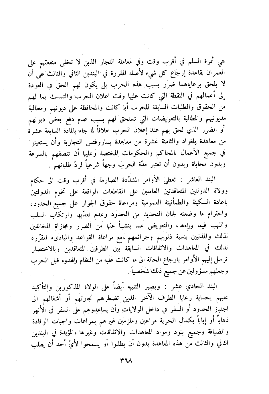 هِيَ ثَمَرَة السّلم فِي اقْربْ وَقت وَفِي مُعَاملَة التُّجَّار الَّذين لَا تخفى منفعتهم على الْعمرَان بقاعدة ارجاع كل شَيْء لاصله المقررة فِي البندين الثَّانِي وَالثَّالِث على ان لَا يلْحق برعاياهم الضَّرَر بِسَبَب هَذِه الْحَرْب بل يكون لَهُم الْحق فِي العودة إِلَى اعمالهم فِي النقطة الَّتِي كَانَت عَلَيْهَا وَقت اعلان الْحَرْب والتمسك بِمَا لَهُم من الْحُقُوق والطلبات السَّابِقَة للحرب ايا كَانَت والمحافظة على دُيُونهم ومطالبة مديونيهم والمطالبة بالتعويضات الَّتِي تسْتَحقّ لَهُم بِسَبَب عدم دفع بعض دُيُونهم أَو الضَّرَر الَّذِي لحق بهم عِنْد اعلان الْحَرْب خلافًا لما جَاءَ بالمادة السَّابِعَة عشر ة من معاهدة بلغراد وَالثَّامِنَة عشرَة من معاهدة بساروفتس التجارية وان يستعينوا فِي جَمِيع الاعمال بالمحاكم والحكومات المختصة وَعَلَيْهَا ان تنصفهم بالسرعة بِدُونِ مُحَابَاة وَبِدُون ان تعْتَبر الْحَرْب وَجها شَرْعِيًّا لرد طلباتهم