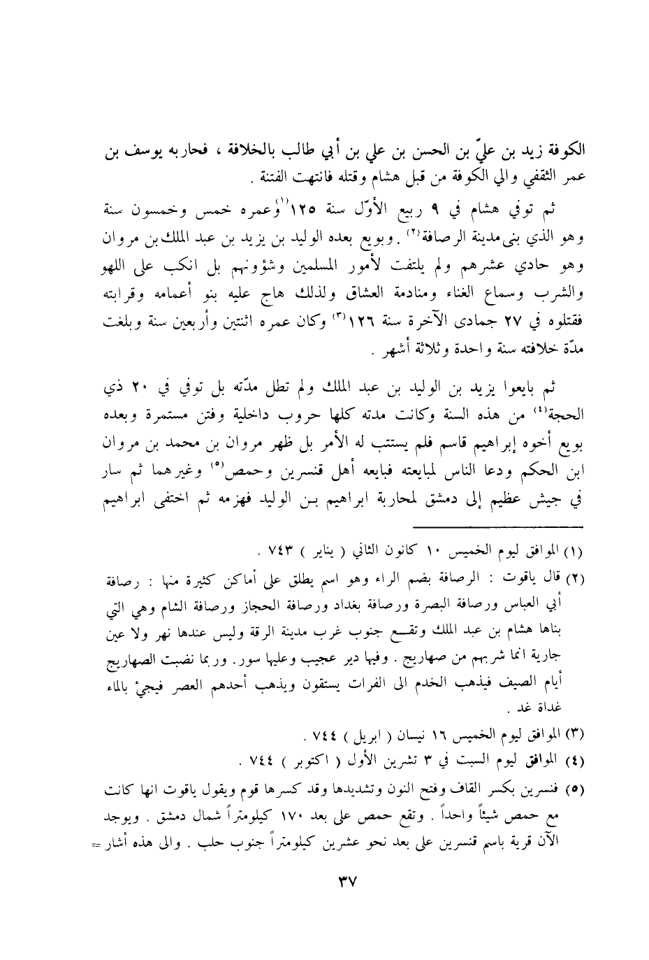 ثمَّ توفّي هِشَام فِي 9 ربيع الاول سنة 125 وعمره خمس وَخَمْسُونَ سنة وَهُوَ الَّذِي بنى مَدِينَة الرصافة وبويع بعده الْوَلِيد بن يزِيد بن عبد الْملك بن مَرْوَان وَهُوَ حادي عشرهم وَلم يلْتَفت لامور الْمُسلمين وشؤونهم بل انكب على اللَّهْو وَالشرب وَسَمَاع الْغناء ومنادمة العشاق وَلذَلِك هاج عَلَيْهِ بَنو اعمامه وقرابته فَقَتَلُوهُ فِي 27 جُمَادَى الْآخِرَة سنة 126 وَكَانَ عمره اثْنَتَيْنِ واربعين سنة وَبَلغت مُدَّة خِلَافَته سنة وَاحِدَة وَثَلَاثَة اشهر