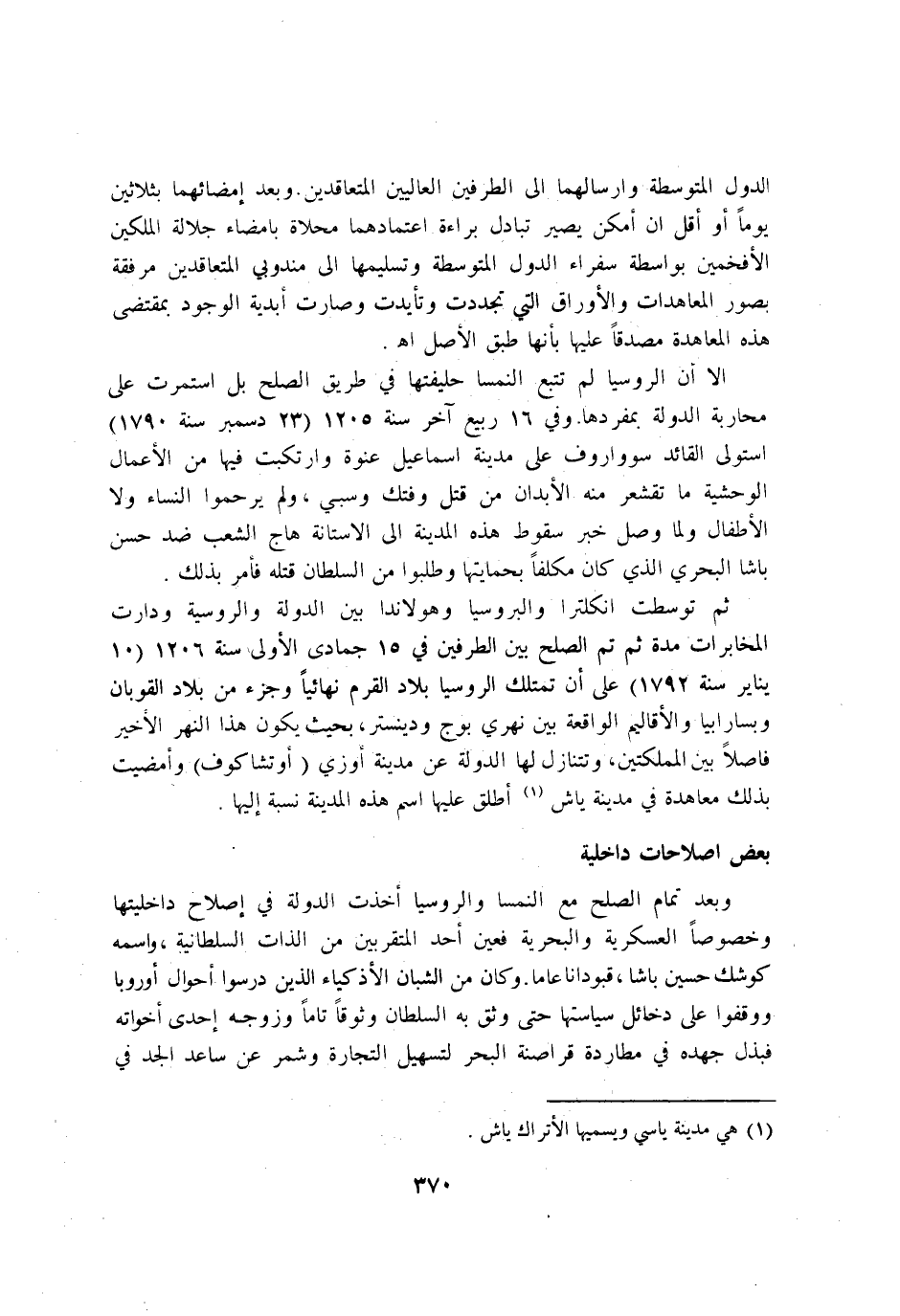 ثمَّ توسطت انكلترا والبروسيا وهولاندا بَين الدولة والروسية ودارت المخابرات مُدَّة ثمَّ تمّ الصُّلْح بَين الطَّرفَيْنِ فِي 15 جُمَادَى الأولى سنة 1206 10 يناير سنة 1792 على ان تمتلك الروسيا بِلَاد القرم نهائيا وجزء من بِلَاد القوبان وبسارابيا والاقاليم الْوَاقِعَة بَين نهري بوج ودينستر بِحَيْثُ يكون هَذَا النَّهر الاخير فاصلا بَين المملكتين وتتنازل لَهَا الدولة عَن مَدِينَة اوزي اوتشاكوف وامضيت بذلك معاهدة فِي مَدِينَة ياش اطلق عَلَيْهَا اسْم هَذِه الْمَدِينَة نِسْبَة اليها